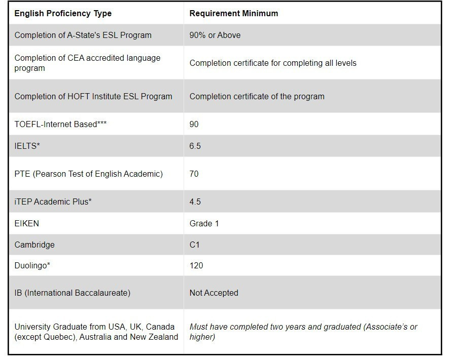 Yêu cầu nhập học linh hoạt: chương trình tiếng anh có các kỳ nhập học vào tháng 1,3,5,7,8,10. Chương trình cử nhân và thạc sĩ sẽ nhập học vào tháng 1,5,8.