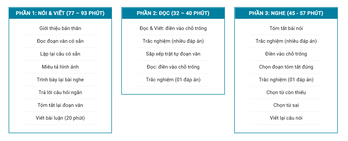 - Phần thi Nghe: đánh giá khả năng Nghe & Đọc hiểu những đoạn thông tin cho sẵn. Các kỹ năng tích hợp cũng được kiểm tra và đánh giá trong phần này.