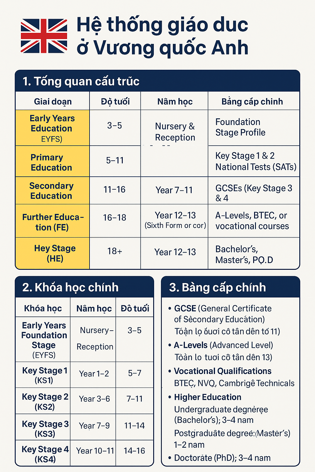 Anh (England) – Áp dụng Chương trình Giáo dục Quốc gia (National Curriculum) với 5 giai đoạn (Key Stages 1–5).