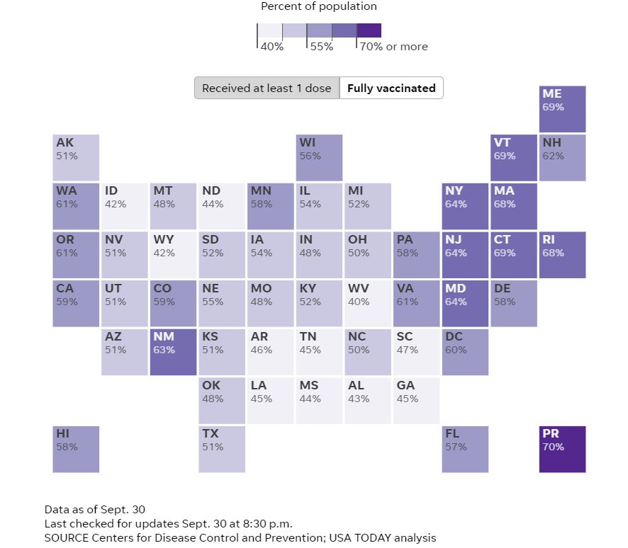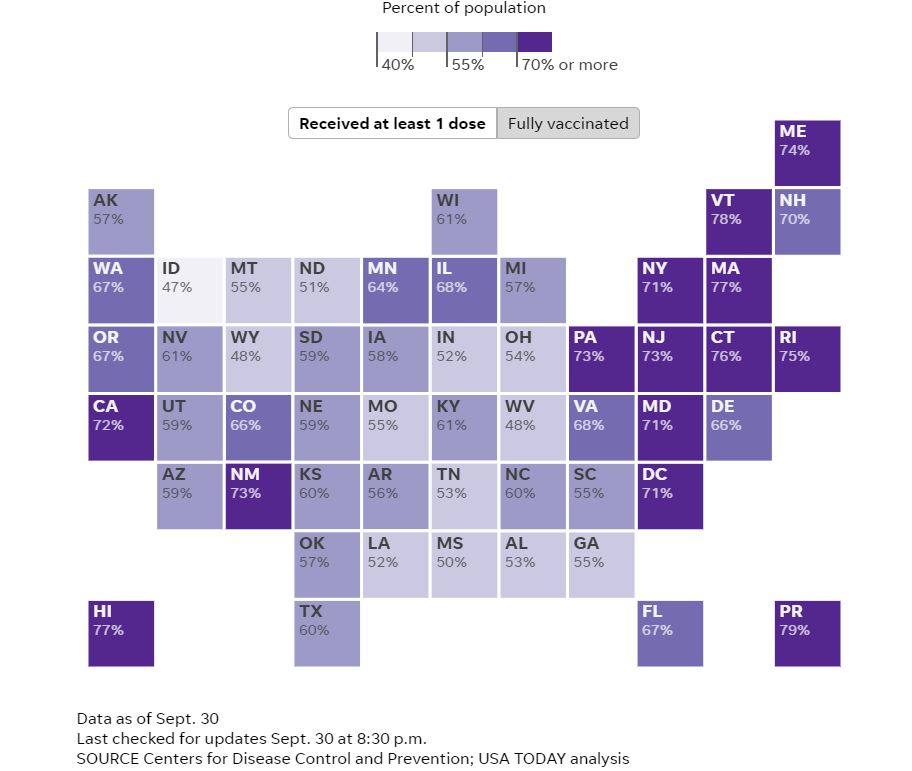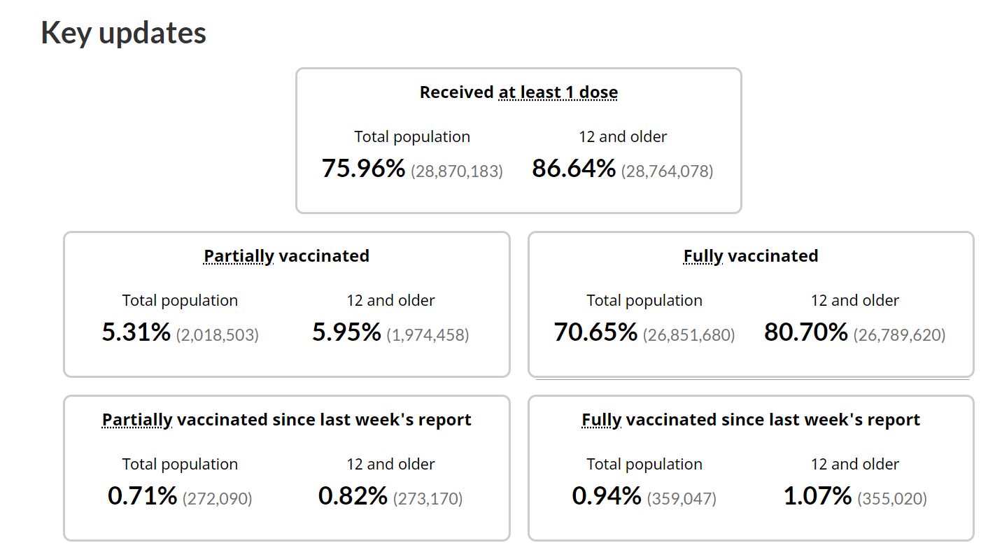 Khoảng 64,6% người dân ở Mỹ đã nhận ít nhất một lần bắn COVID-19. Khoảng 55,6% người dân được tiêm chủng đầy đủ.