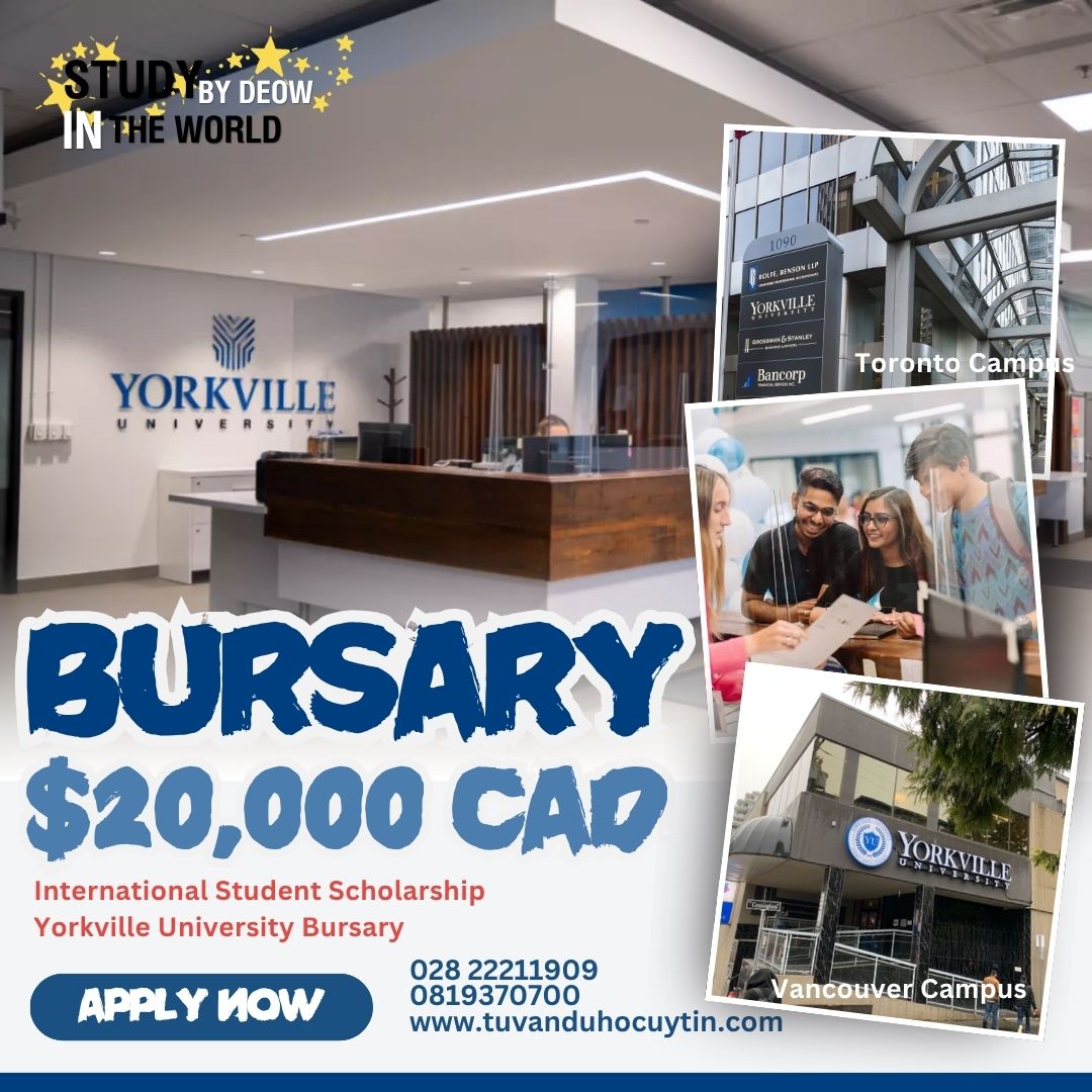 Nhận học bổng tự động trị giá 10.000 đô la dành cho sinh viên quốc tế bậc đại học tại Đại học Yorkville, dành cho ứng viên từ mọi quốc gia. Học bổng độc quyền này, khi nộp đơn thông qua DEOW Vietnam, giúp giảm chi phí học phí và có thể được kết hợp với Học bổng tổng giá trị tài trợ lên đến 20.000 đô la. Không cần nộp đơn và không có hạn chót nộp đơn, khiến đây trở thành cơ hội tài trợ dễ dàng cho sinh viên quốc tế theo học bậc đại học.