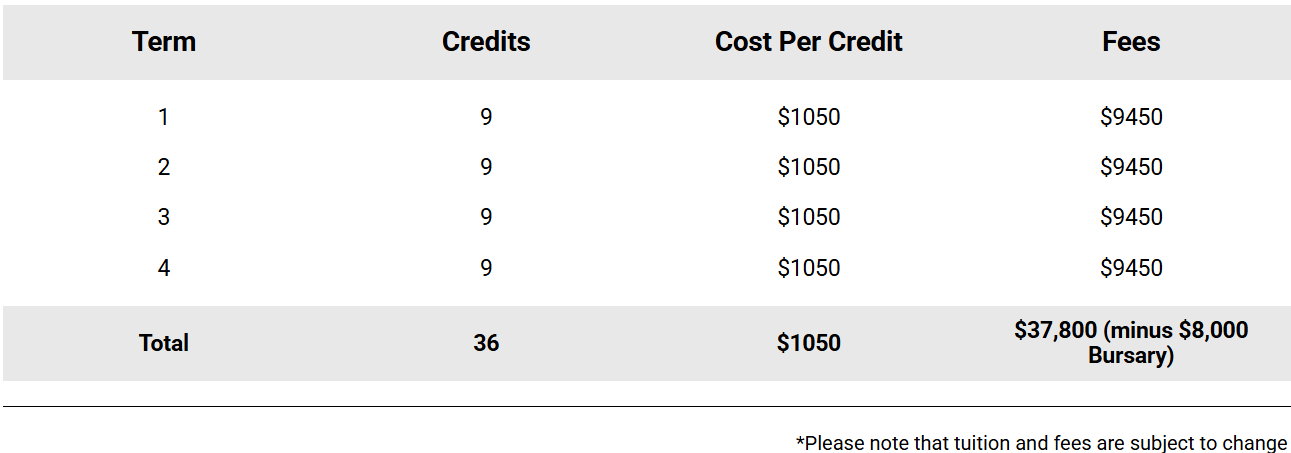 Chi phí mỗi tín chỉ: 1.050 đô la.. Sinh viên phải hoàn thành 36 tín chỉ. Một khóa học thông thường gồm 3 tín chỉ.