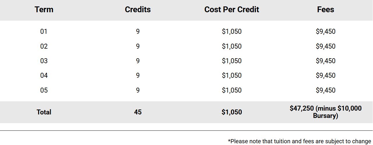 Giả sử khối lượng khóa học trung bình, học phí mỗi học kỳ là 9.450 đô la. Việc lựa chọn học nhiều hơn hoặc ít hơn mỗi học kỳ sẽ được cập nhật tương ứng. Tổng học phí chương trình có thể thay đổi dựa trên số tín chỉ chuyển đổi thực tế và các khóa học tương đương.