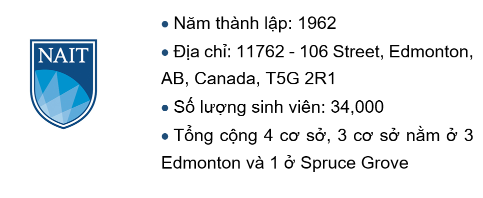 Northern Alberta Institute of Technology (NAIT) tọa lạc tại thành phố Edmonton, Alberta; là học viện bách khoa hàng đầu và lớn nhất Canada. Nền giáo dục thực hành, dựa trên công nghệ và nghiên cứu ứng dụng của NAIT rất cần thiết cho năng suất và sự thịnh vượng của Alberta. Phát triển sự nghiệp của bạn bằng phương pháp học tập thực hành và ứng dụng, quy mô lớp học nhỏ và sử dụng công nghệ mới nhất