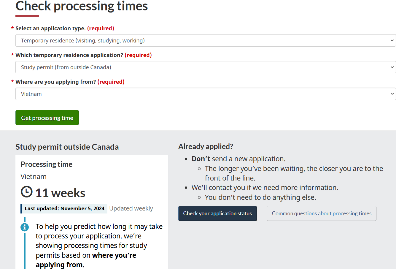 Thời gian xử lý giấy phép du học thông thường khác nhau tùy theo quốc gia. Ví dụ, tính đến ngày 8 tháng 11, thời gian xử lý trung bình đối với các đơn nộp từ Ấn Độ hiện là 8 tuần và Vietnam là 11 tuần.