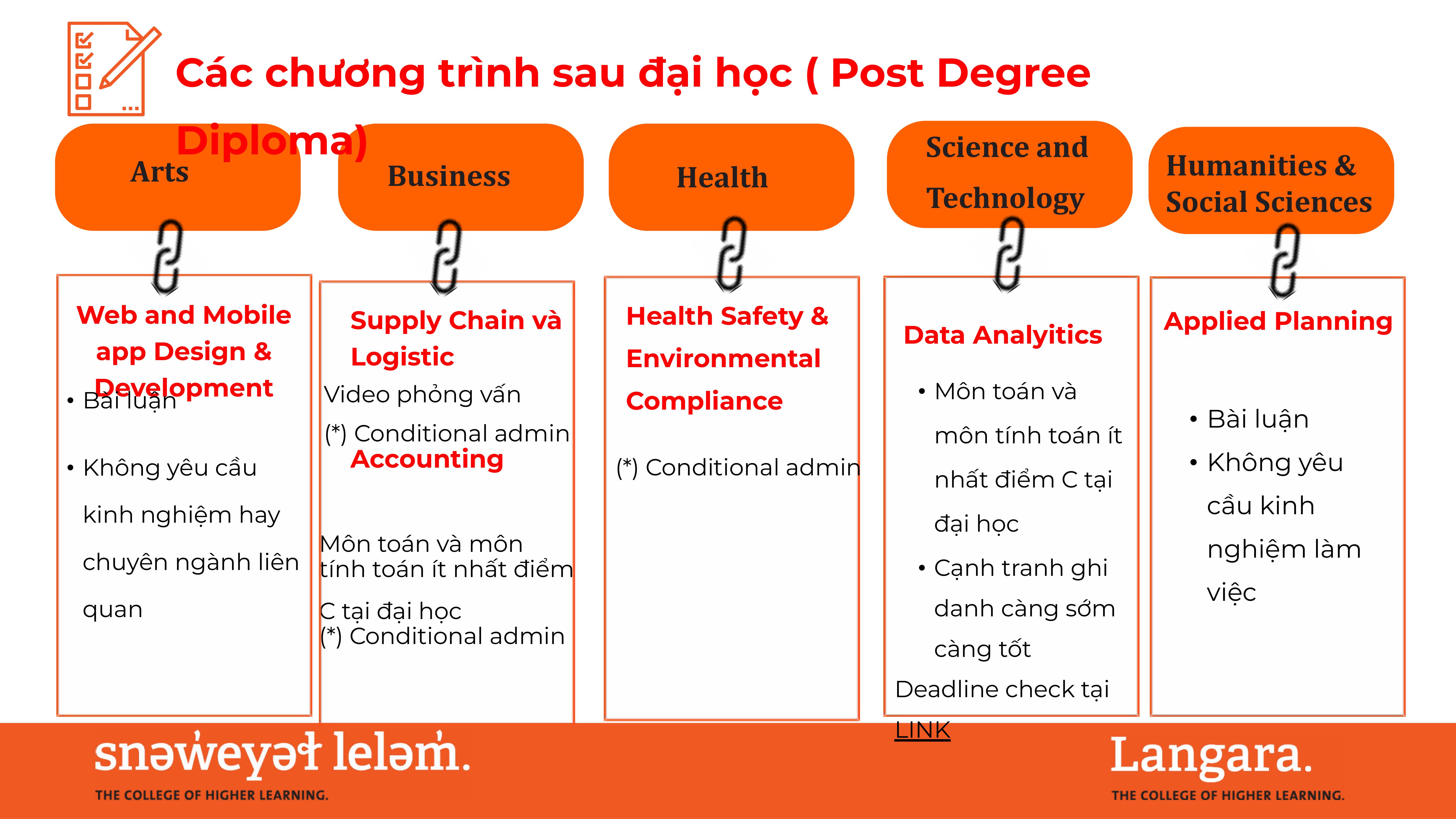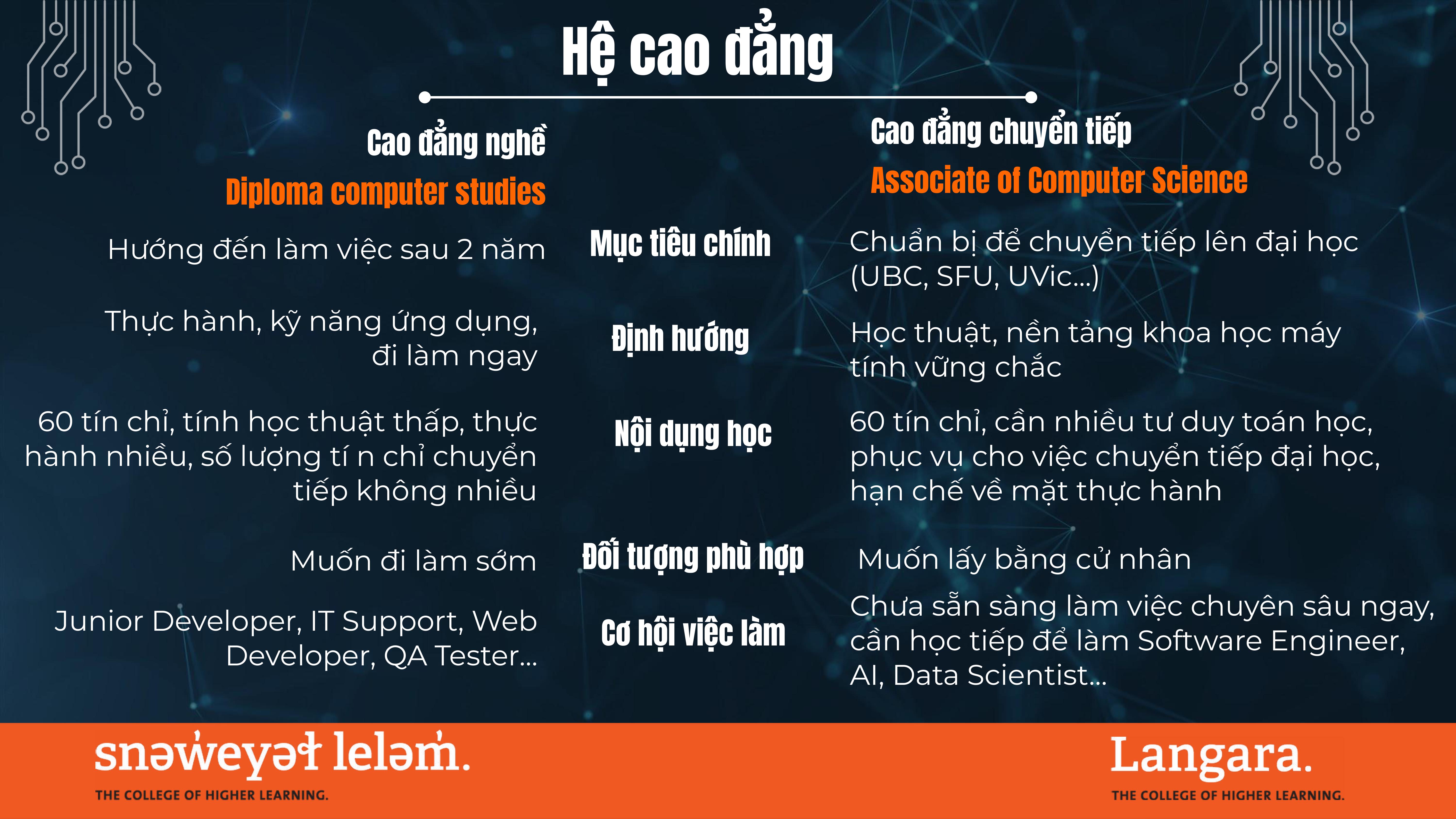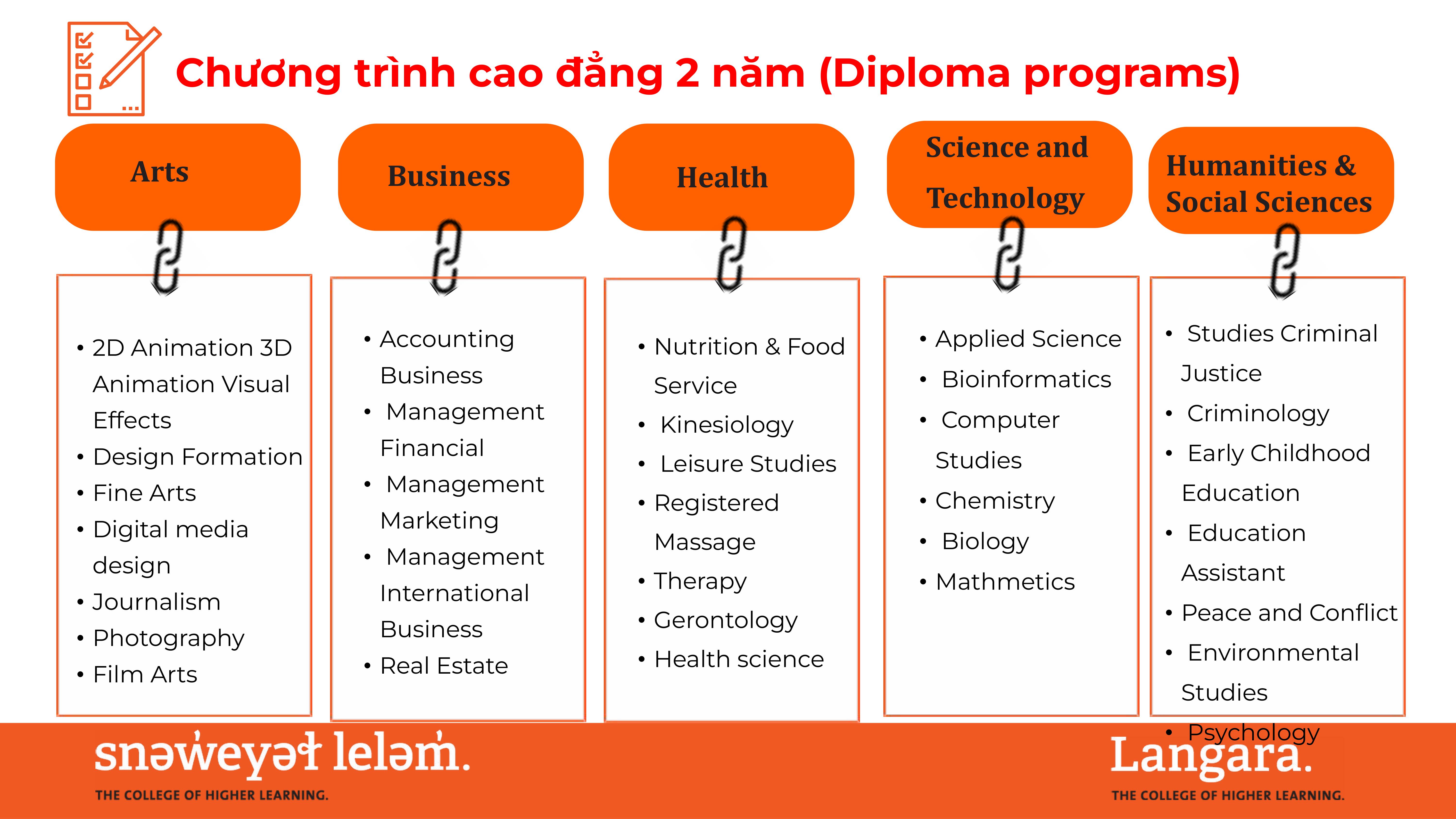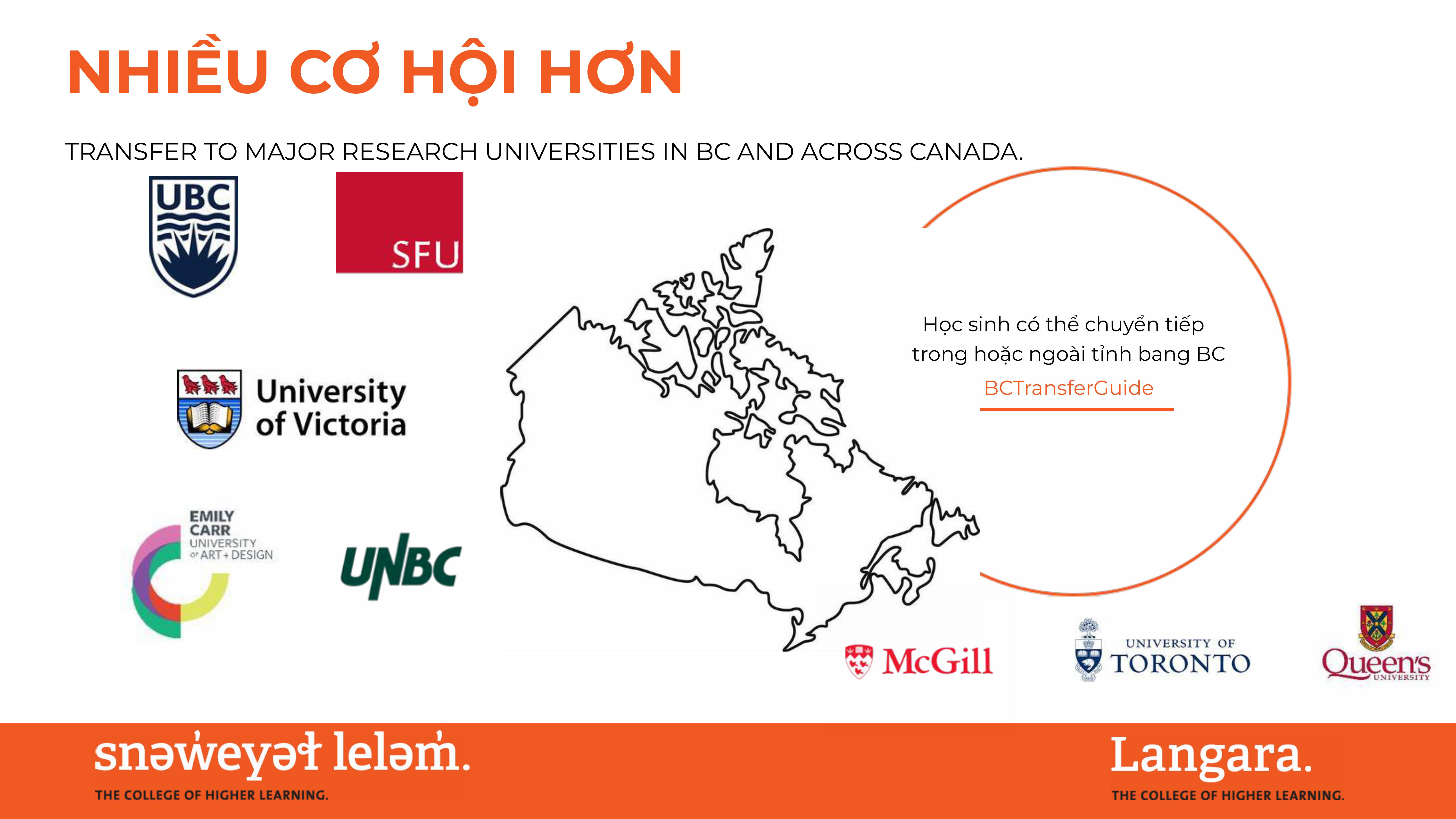Hoàn tất năm thứ nhất hoặc năm thứ hai tại Langara sau đó chuyển tiếp lên đại học để hoàn tất cử nhân