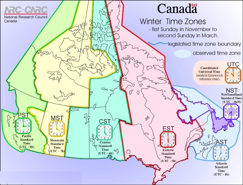 Canada có sáu múi giờ. Múi giờ ở điểm cực đông Newfoundland chậm 3,5 giờ so với giờ quốc tế GMT (Greenwich Mean Time). Các múi giờ khác là múi giờ Đại Tây Dương, múi giờ miền Đông, múi giờ miền Trung, múi giờ vùng Rocky Mountain và cuối cùng là múi giờ Thái Bình Dương, chậm 8 giờ so với GMT.