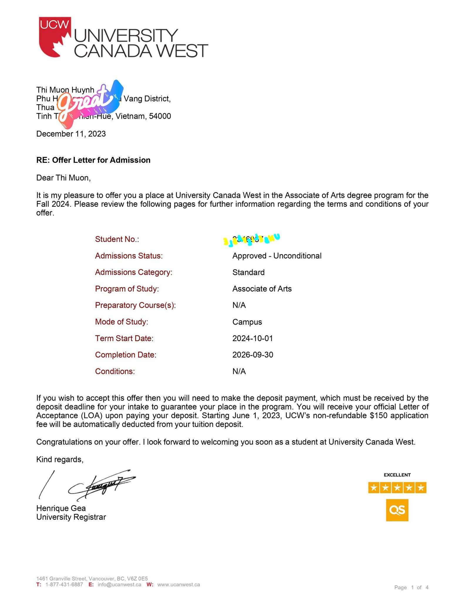 Deow nhận được tin rất vui về bạn học sinh nhận được thư mời nhập và còn vui hơn nữa khi bạn vinh dự được trường UCW cấp bổng trị giá $6,804.00 CAD cho chương trình Associate of Arts kỳ nhập học mùa thu, 2024.