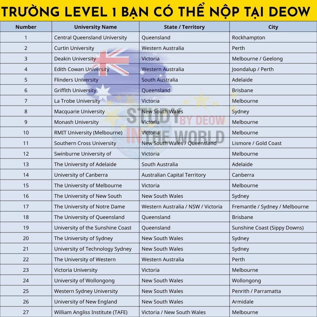 | DANH SÁCH ĐẠI HỌC ÚC THUỘC LEVEL 1 - HỌC SINH CÓ THỂ NỘP ĐƠN TẠI DU HỌC DEOW VIETNAM | ||||