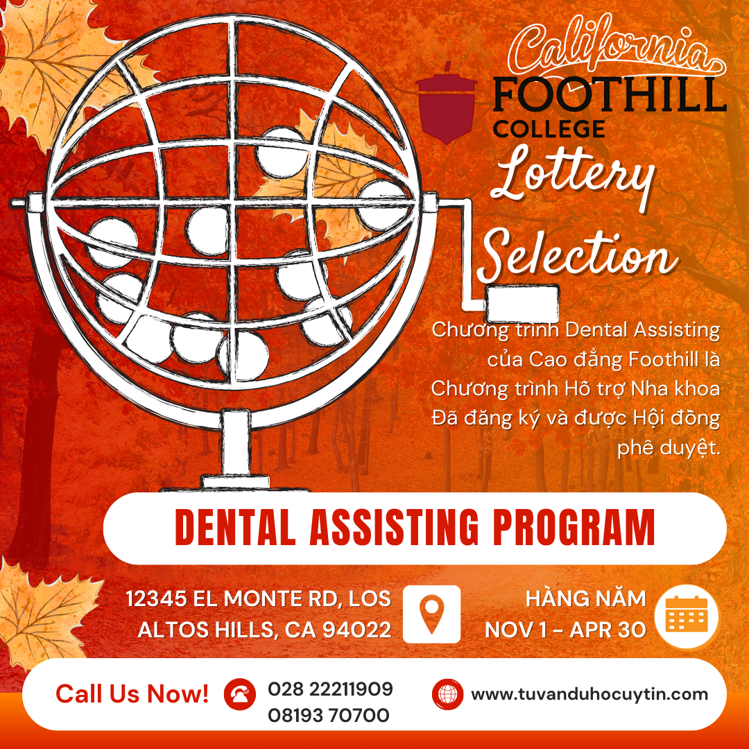 Bạn có biết Chương trình Trợ lý Nha Khoa tại Foothill College tuyển sinh bằng hình thức bốc thăm! Chọn ra 24 học sinh đủ điều kiện mỗi năm thông qua hình thức bốc thăm ngẫu nhiên. Việc tuyển sinh chỉ diễn ra một lần mỗi năm, vì vậy hãy đảm bảo hoàn thành tất cả các bước trong thời gian nộp đơn.
