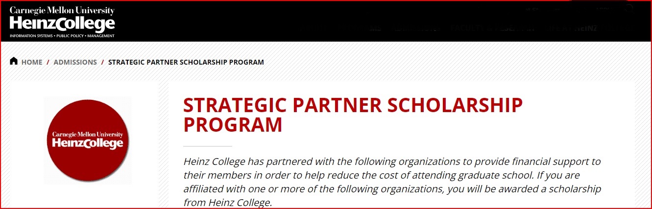 HEINZ COLLEGE STRATEGIC PARTNERS SCHOLARSHIPS: Heinz đã hợp tác với một số tổ chức để hỗ trợ tài chính cho các thành viên của họ nhằm giảm chi phí theo học chương trình sau đại học. Nếu sinh viên liên kết với một hoặc nhiều tổ chức đối tác này, sẽ đủ điều kiện nhận Học bổng Đối tác Chiến lược từ Heinz. Để được xem xét, sinh viên cần nêu rõ trong đơn xin nhập học kinh nghiệm hoặc sự tham gia của mình với một hoặc nhiều tổ chức đối tác.