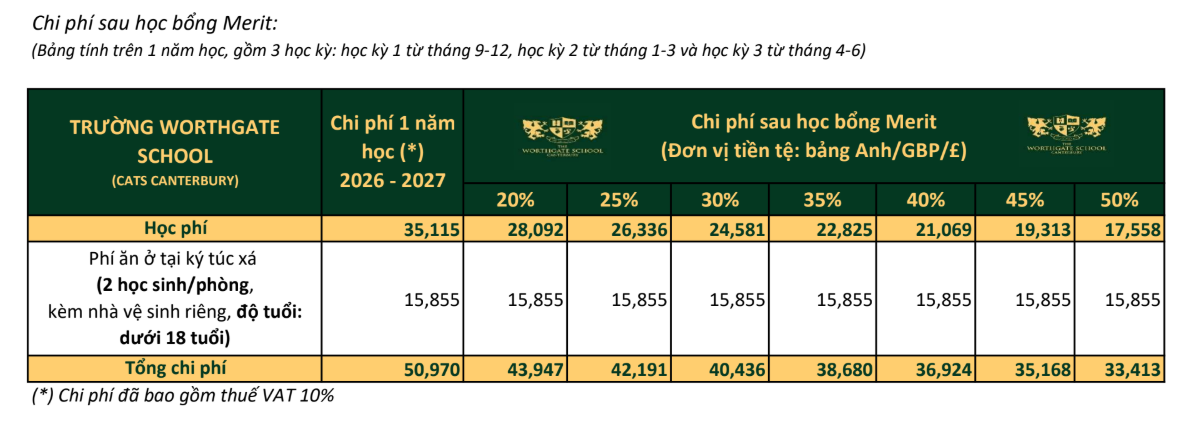 Học bổng 140% Worthgate Oxbridge (100% học phí và 40% Ăn ở)