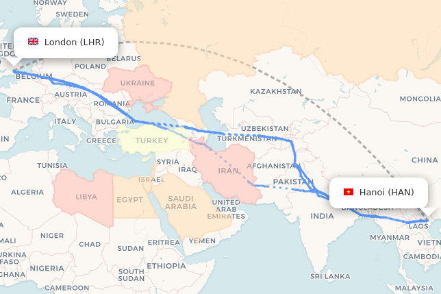 Có các chuyến bay thẳng (Vietnam Airlines) và một số lựa chọn dừng một điểm dừng; giá vé khứ hồi thường bắt đầu từ khoảng GBP ~652 / USD ~650+ tùy thuộc vào ngày (đặt vé sớm để có giá tốt nhất). Thời gian bay thẳng từ HAN→LHR là khoảng ~12–13 giờ.