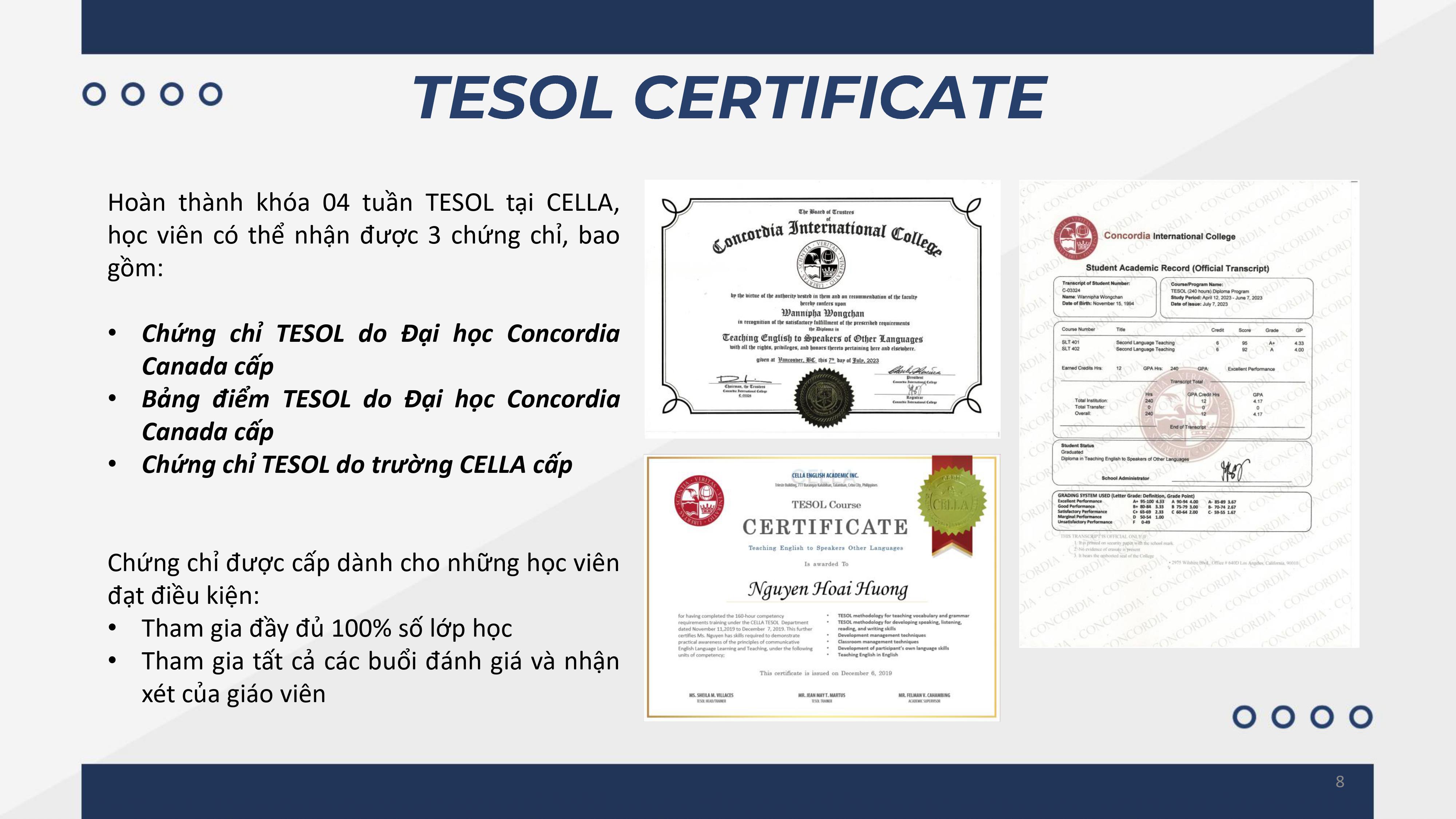 - Chứng chỉ TESOL do Đại học Concordia Canada cấp