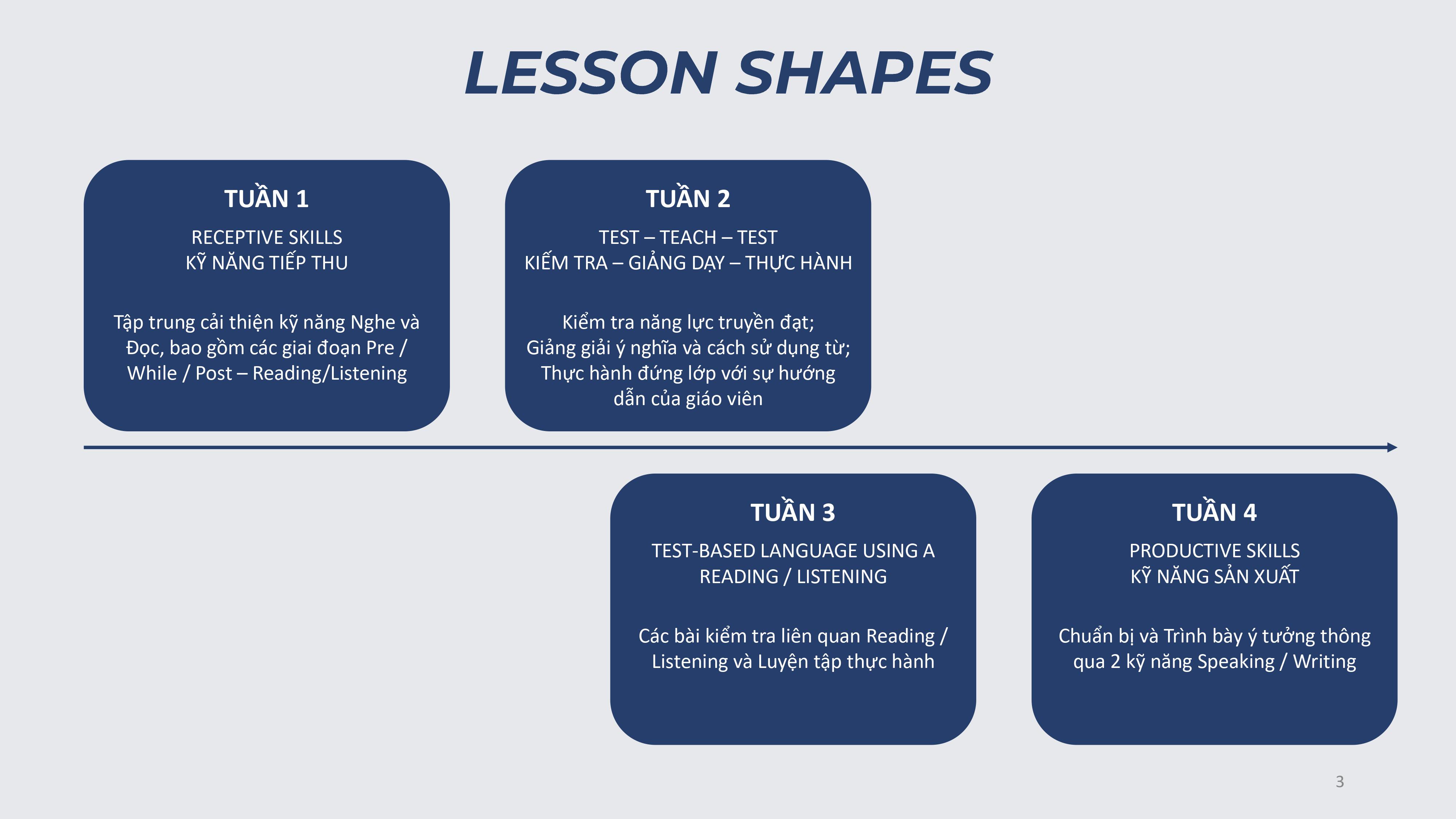 Tập trung vào cải thiện kỹ năng Nghe và Đọc cho học viên, bao gồm các giai đoạn Pre / While / Post – Reading/Listening