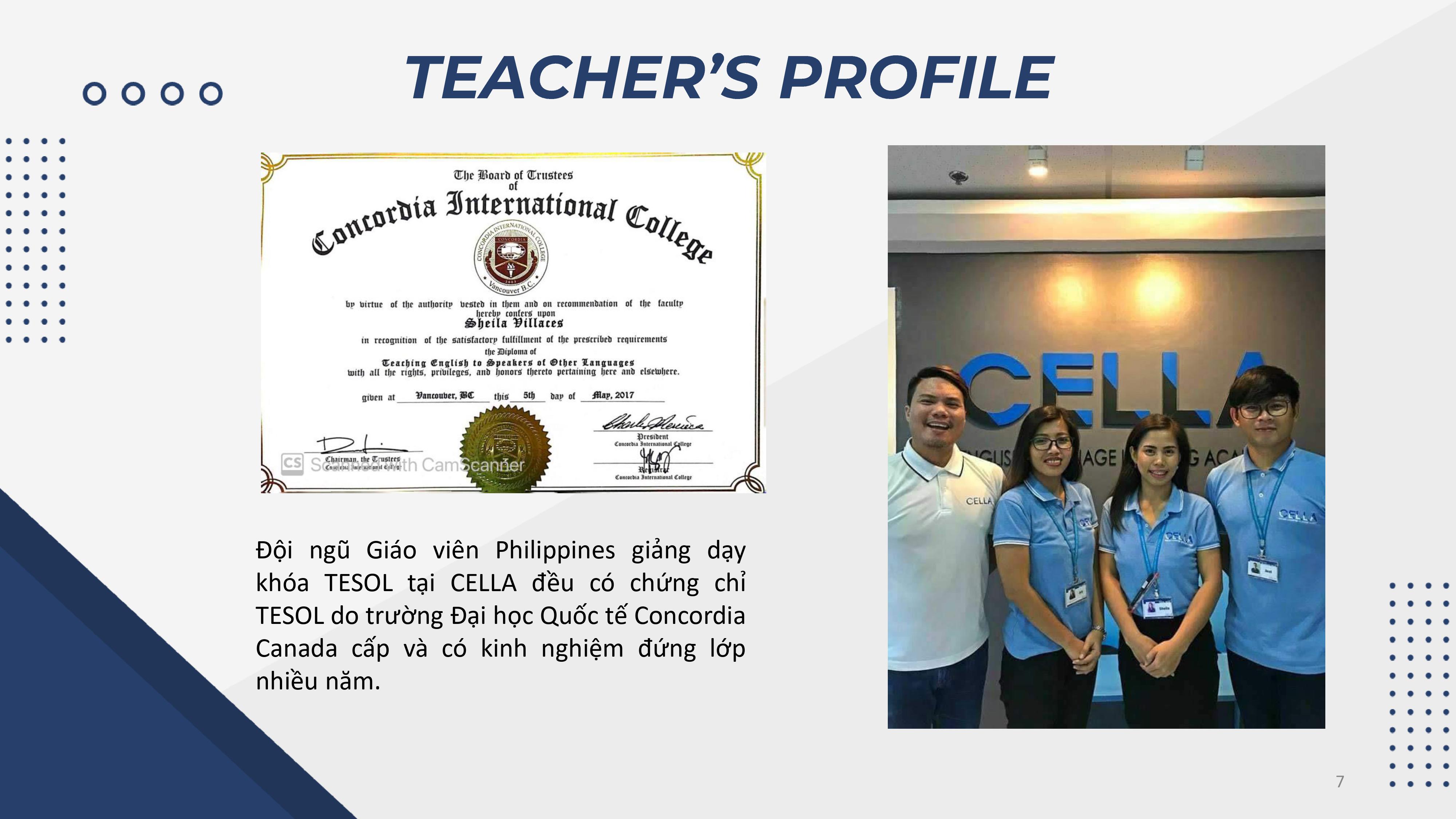 Đội ngũ Giáo viên Philippines giảng dạy khóa TESOL tại trường Anh ngữ CELLA đều có chứng chỉ TESOL do trường Đại học Quốc tế Concordia Canada cấp và đều có kinh nghiệm đứng lớp trên 10 năm.