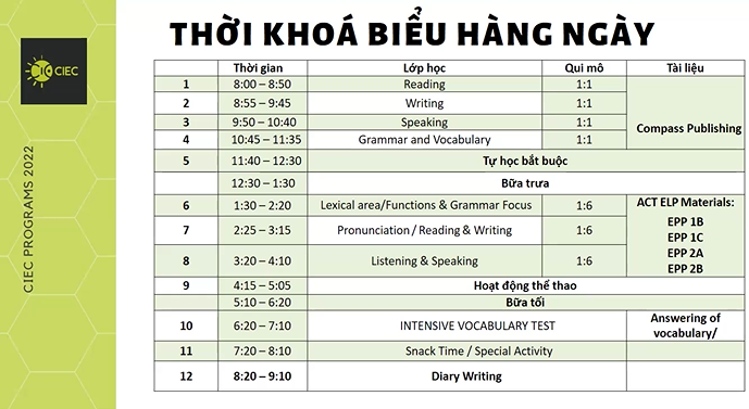 Tại trại hè CIEC, các bạn sẽ được học 500 phút mỗi ngày, bao gồm các lớp học 1:1, các lớp học nhóm nhỏ và lớp học nhóm lớn cũng như các hoạt động tự học.