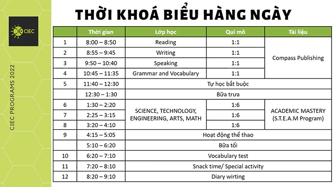 Thời khóa biểu hàng ngày chương trình STEAM: