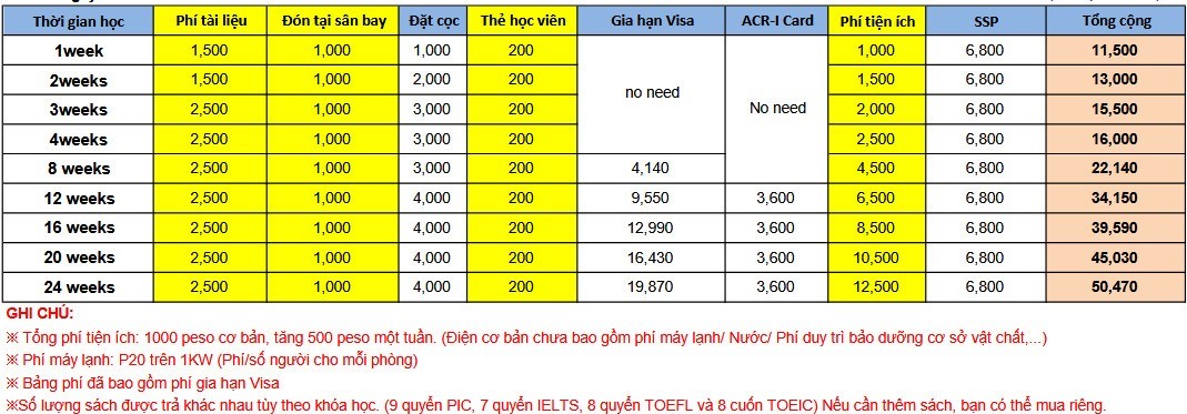 4/ Phí tiện ích (phí điện nước cơ bản, dọn dẹp phòng ở, sửa chữa duy trì bảo dưỡng CSVC): Mức căn bản cho 1 tuần là 1,000p. Sau đó tăng 500p/ tuần.
