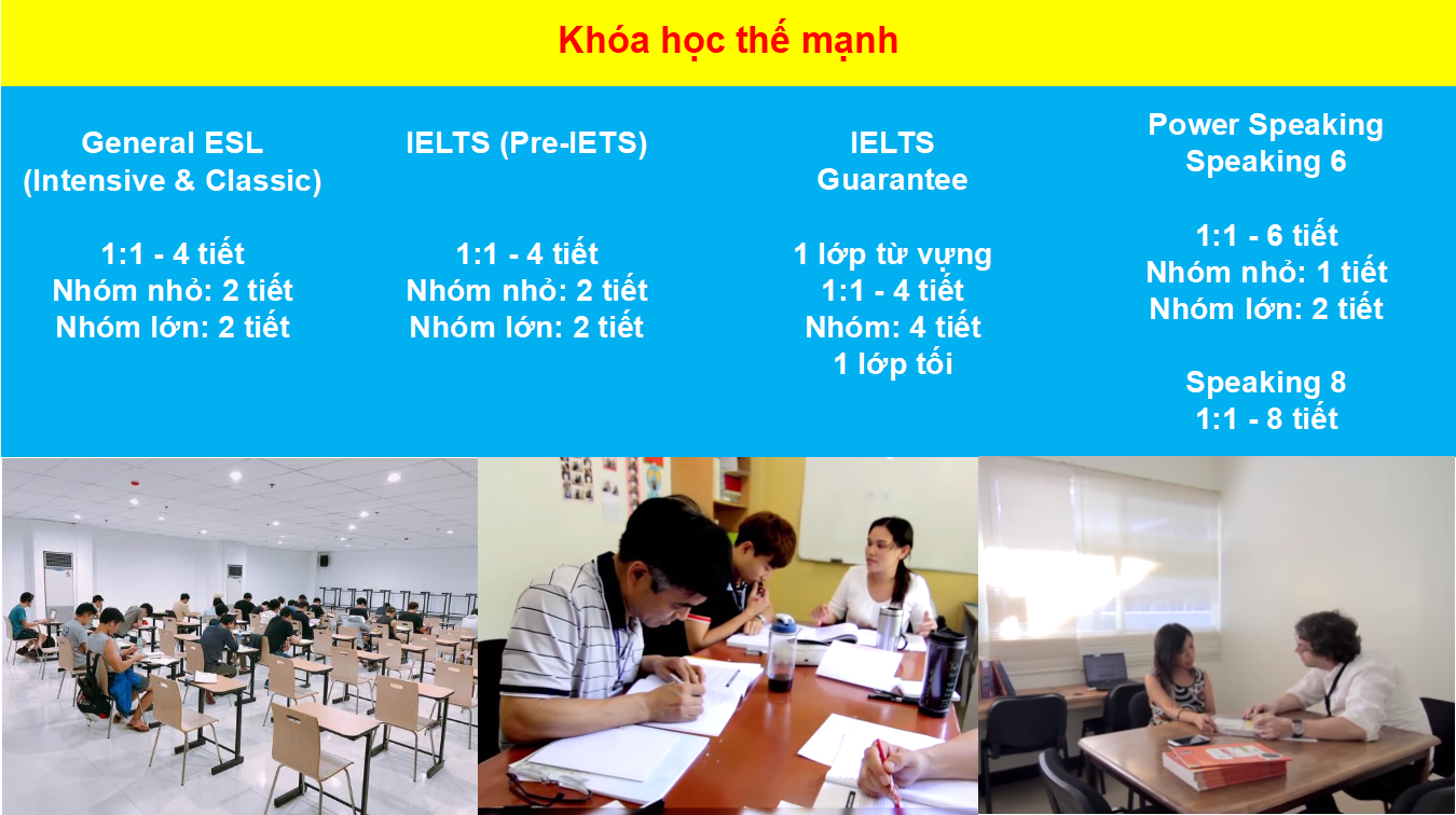 ? Chương trình học đa dạng từ các Lớp tiếng Anh tổng quát, Pre-IELTS, IELTS (Academic & General), IELTS đảm bảo và Power Speaking, TOEIC đến các khóa học cho gia đình.