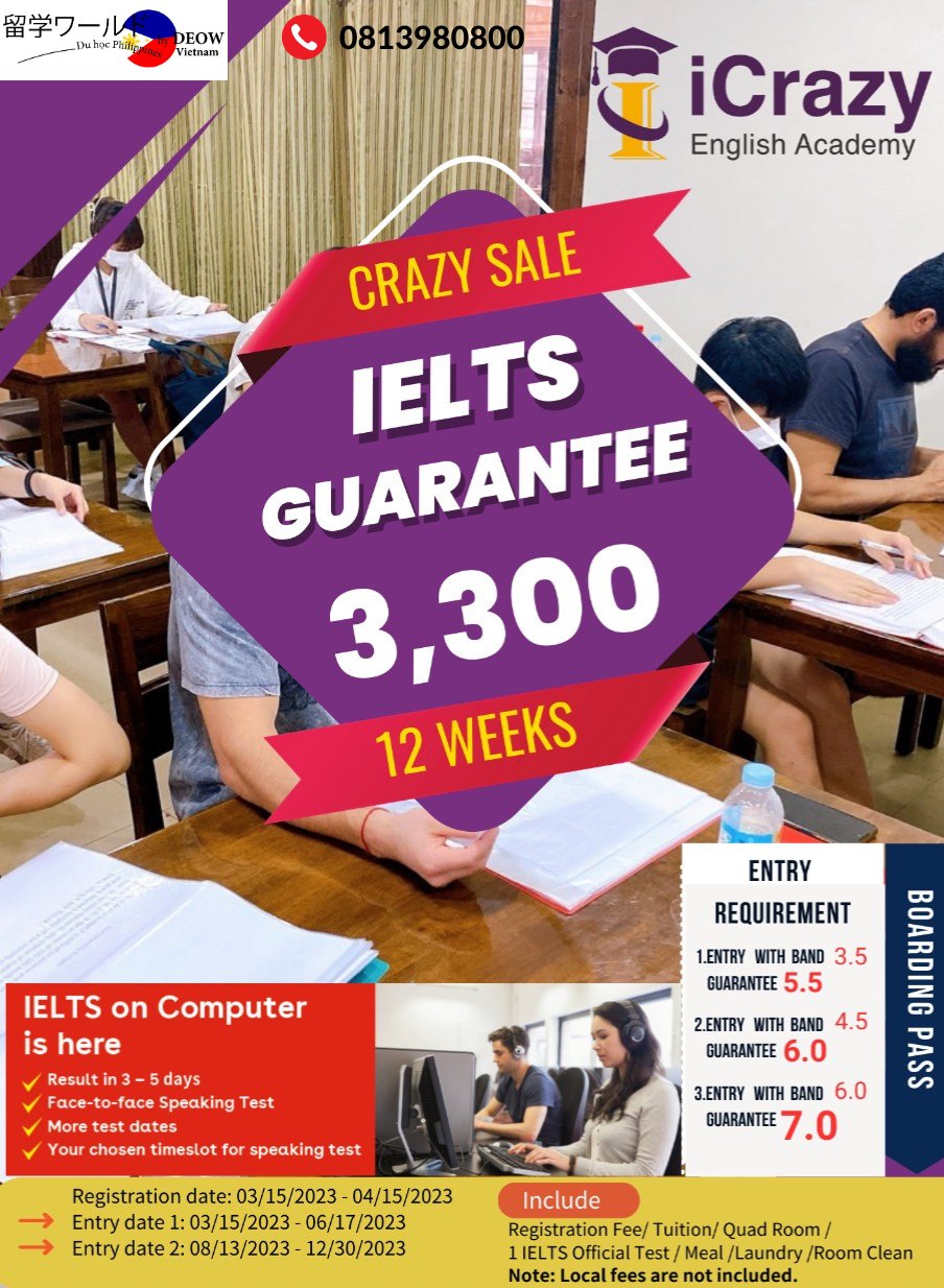 Du học DEOW Vietnam xin gửi đến các bạn thông tin về chương trình khuyến mãi cực kì hấp dẫn từ trường Anh ngữ iCrazy dành cho các bạn học viên khi đăng kí khóa IELTS đảm bảo 12 tuần.