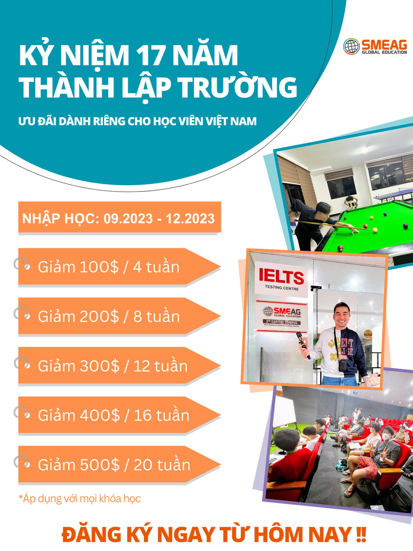 Lưu ý: Học phí được giảm đã bao gồm phí đăng kí, học phí, phí ký túc xá và 1 lần thi IELTS Official