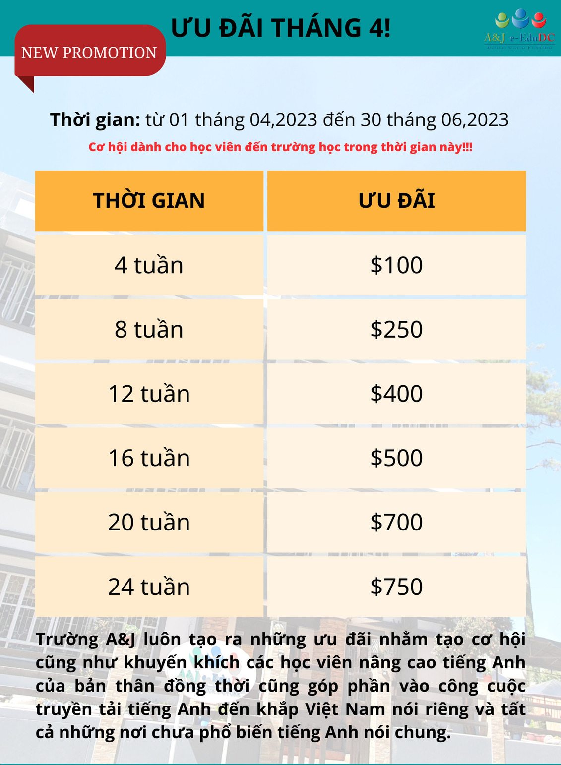 ? Khi đăng ký tại trường A&J, học viên sẽ nhận được ưu đãi như sau tương ứng với thời gian của khóa học: