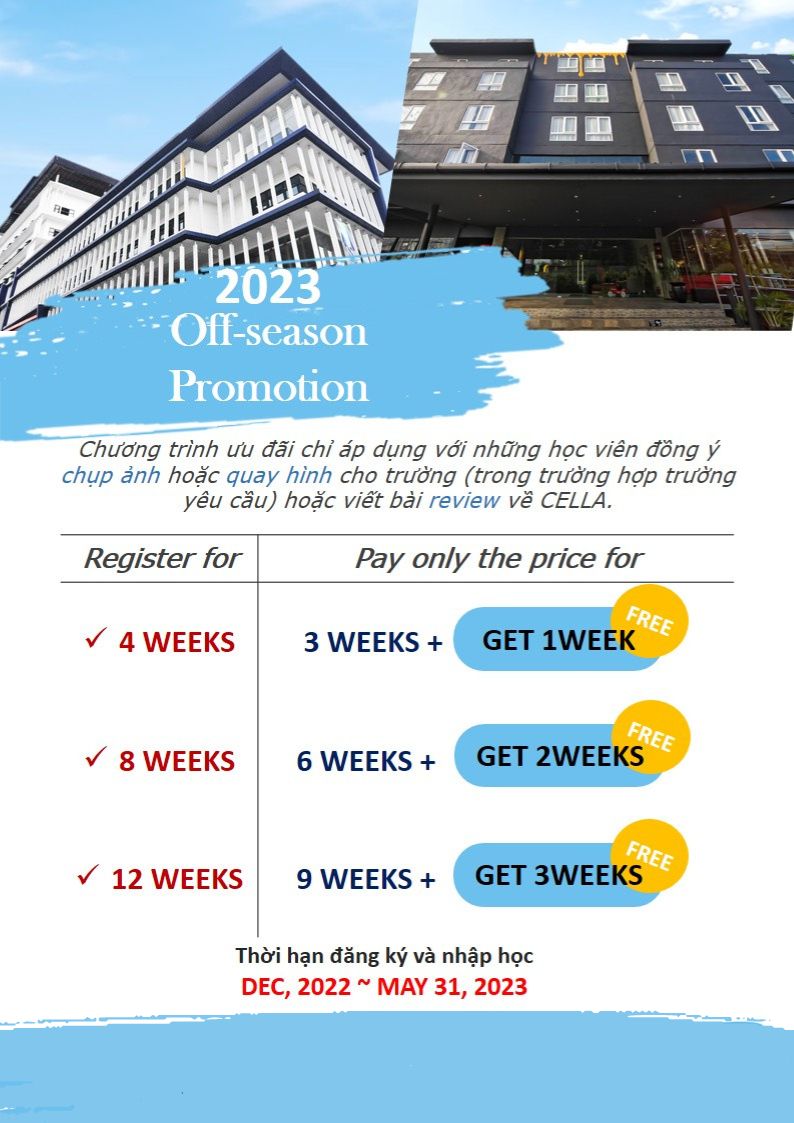 *Miễn phí học phí + phí ký túc xá, cho bất kỳ khóa học nào tại CELLA (trừ TESOL)