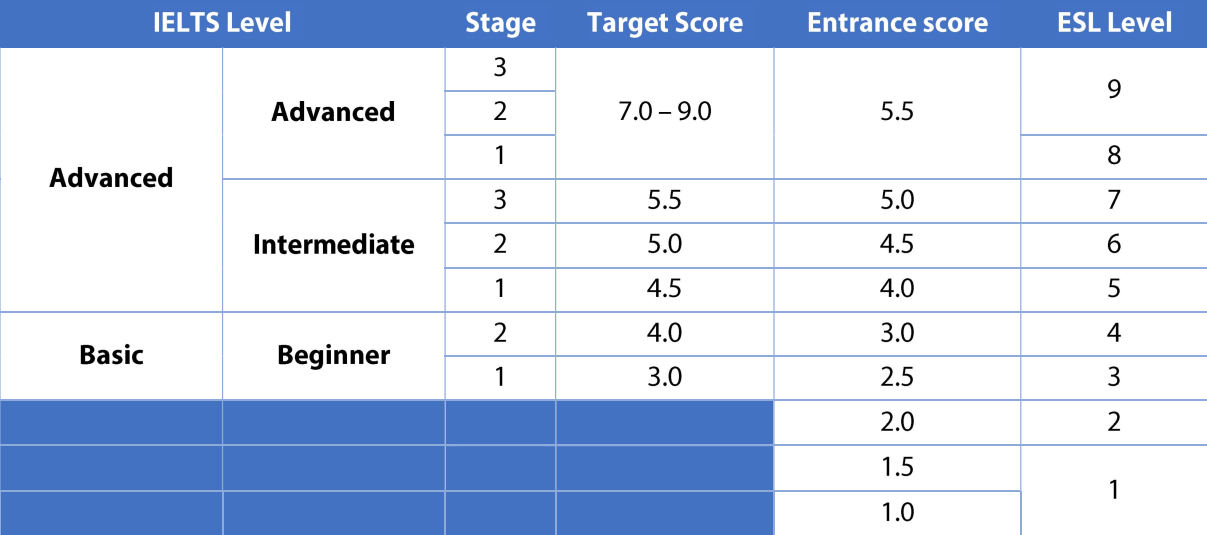 Ví dụ: bạn đang ở mức level 1, đăng kí học 12 tuần ESL, mục tiêu của bạn nên là ESL level 4, tương đương VỚI 4.0 IELTS.