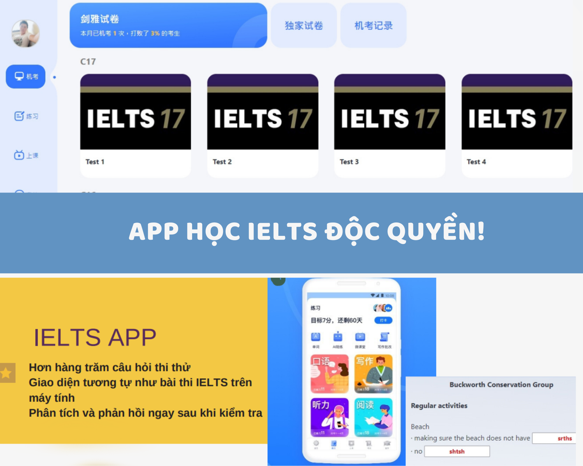 ? Lớp kiểm tra đọc: Các bài kiểm tra đọc trong khóa học này là tài liệu đọc thực tế được sử dụng trong các kỳ thi IELTS trước đây, vì vậy mọi thứ bạn học đều đến từ các bài kiểm tra thực tế. Bài kiểm tra kết thúc thì ngay lập tức giáo viên sẽ sửa đáp án và giải thích