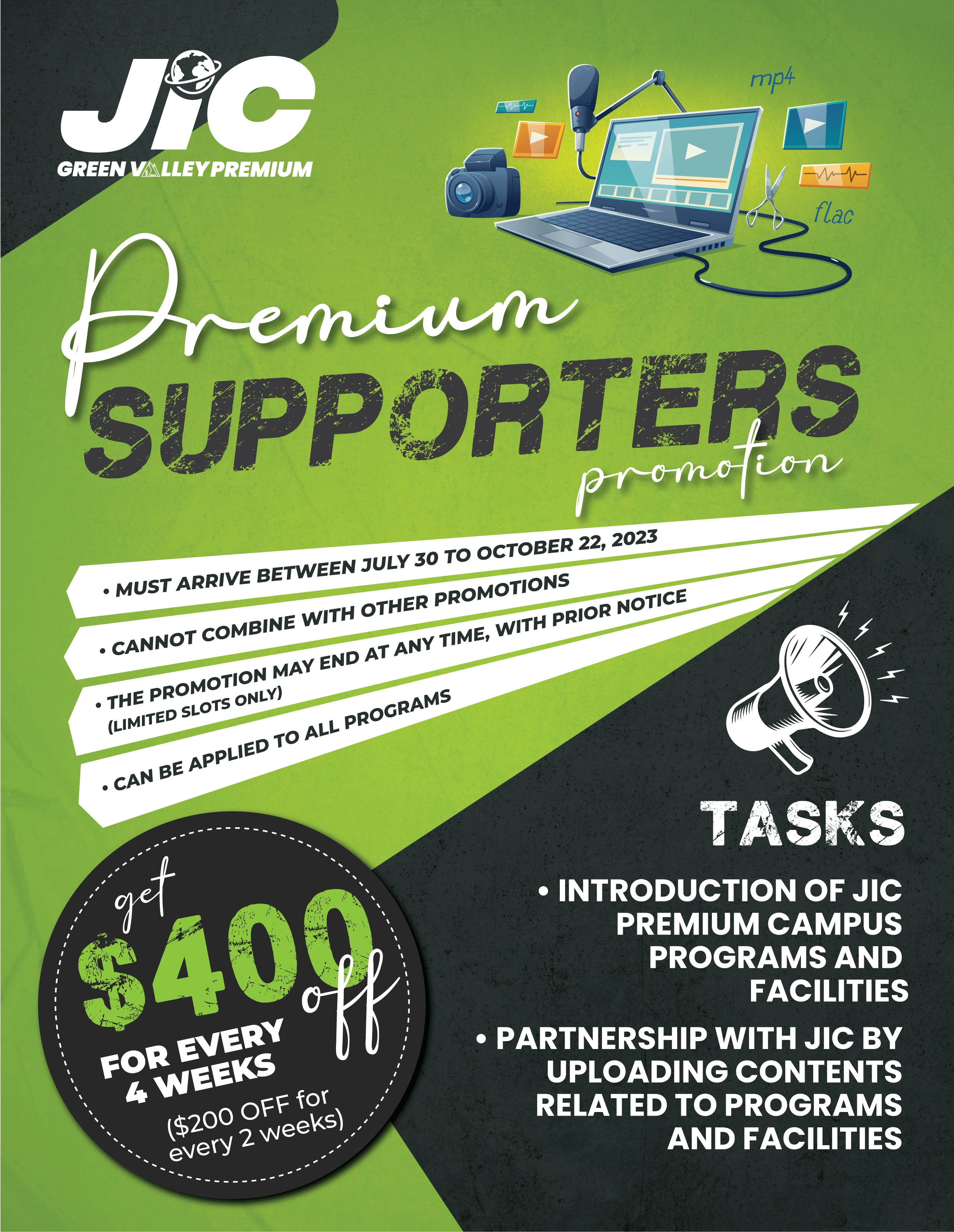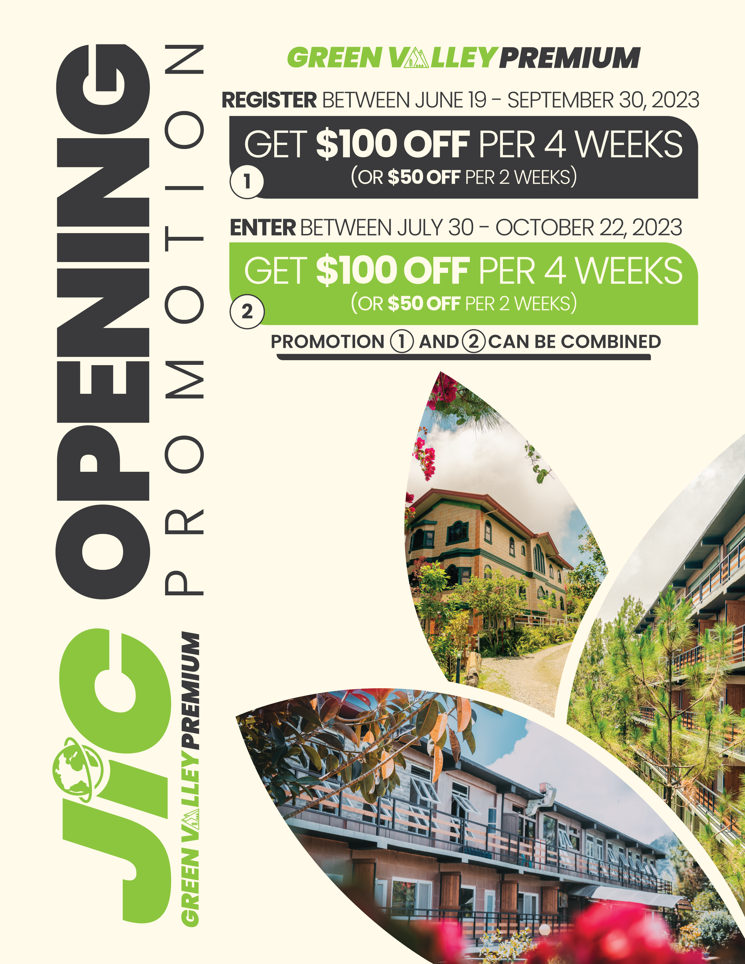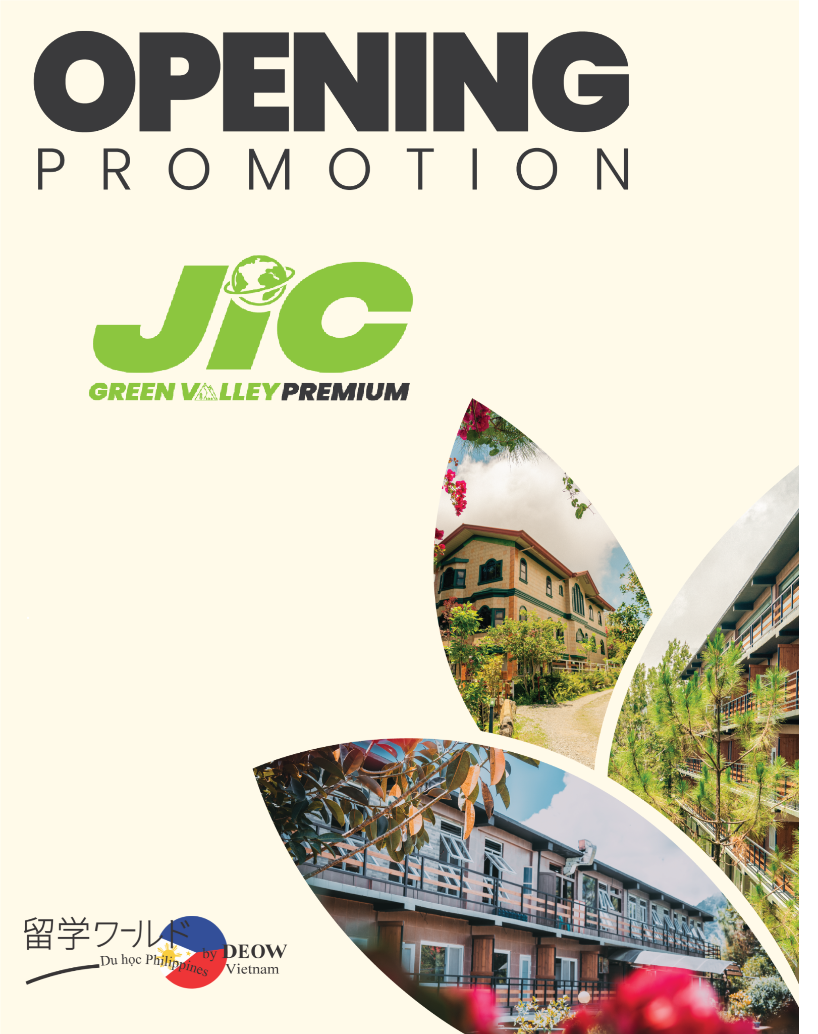 Trường Anh ngữ JIC – đơn vị tiên phong trong ngành công nghiệp ESL (tiếng Anh giao tiếp). JIC có kinh nghiệm đào tạo Anh ngữ trong suốt 20 năm. Nhân dịp khai trương campus mới là Green Valley Premium trường đã tung hàng loạt ưu đãi hấp dẫn dành cho tất cả các bạn học viên.