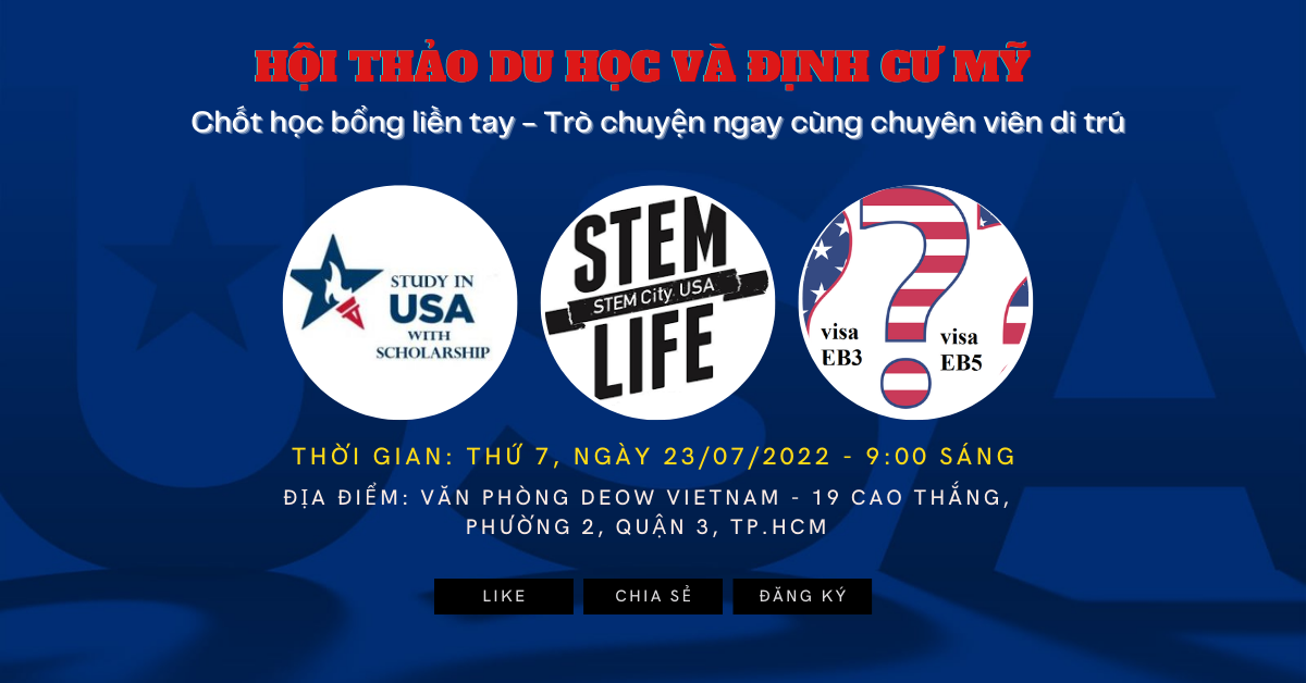 Chủ đề: Chốt học bổng liền tay – Trò chuyện ngay cùng chuyên viên di trú Mỹ. Thời gian: Thứ 7, ngày 23/07/2022 lúc 9:00 sáng. Hình thức: Online và trực tiếp tại văn phòng DEOW.