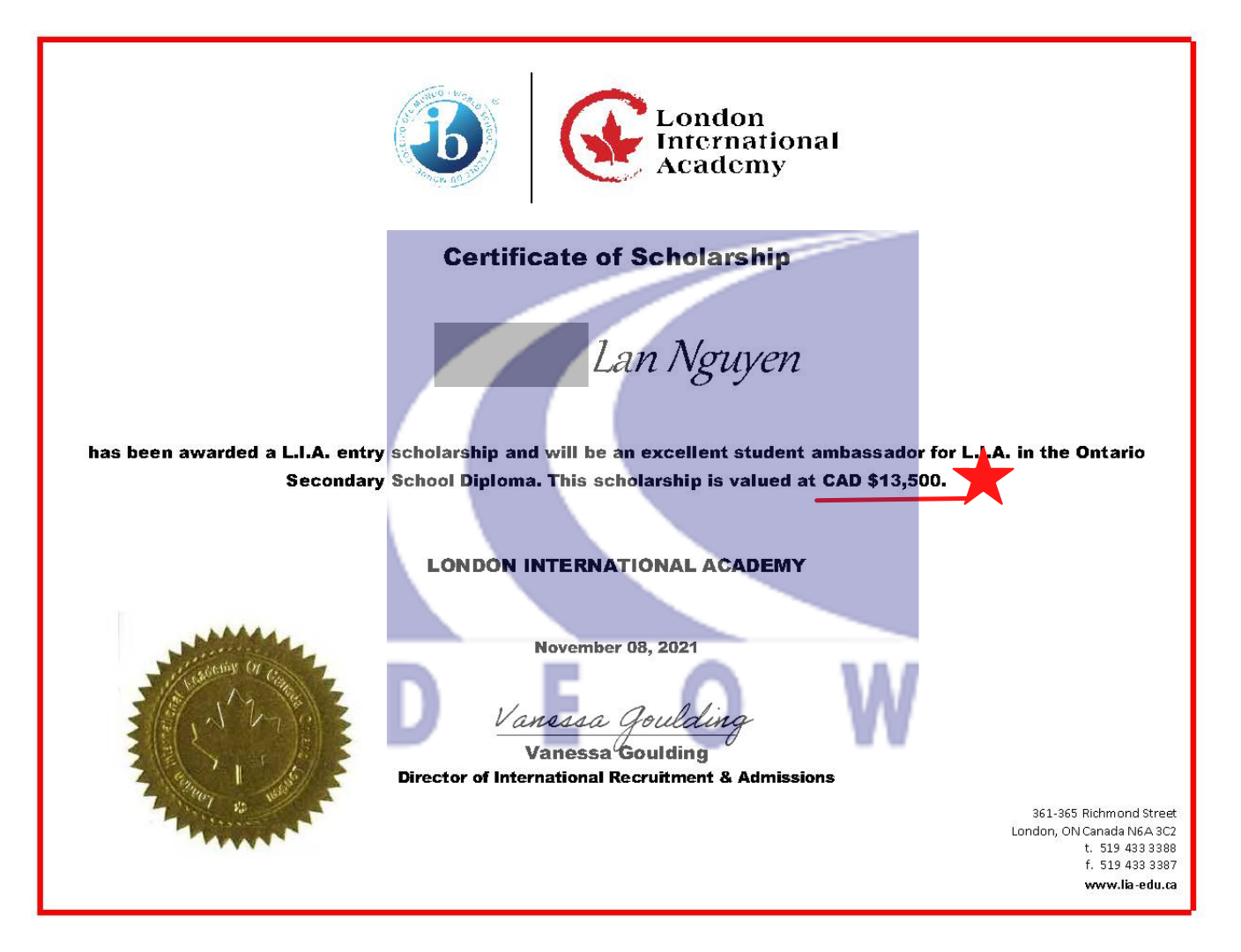 London International Academy (LIA) là một trong những ngôi trường trung học tư thục nội trú và bán trú chất lượng của Canada, nằm trong “Thành phố rừng” xinh đẹp của London, Ontario. Trường hiện là một trong số ít những trường có học bổng khá cao lên đến 100% học phí dành cho học sinh quốc tế. Học sinh của DEOW trong tháng 11 cũng đã thành cộng nhận được 2 học bổng có giá trị nhất tại trường là 100% và 70% học phí. Hãy cùng DEOW tham gia sự kiện để biết thêm thông tin về trường nhé.