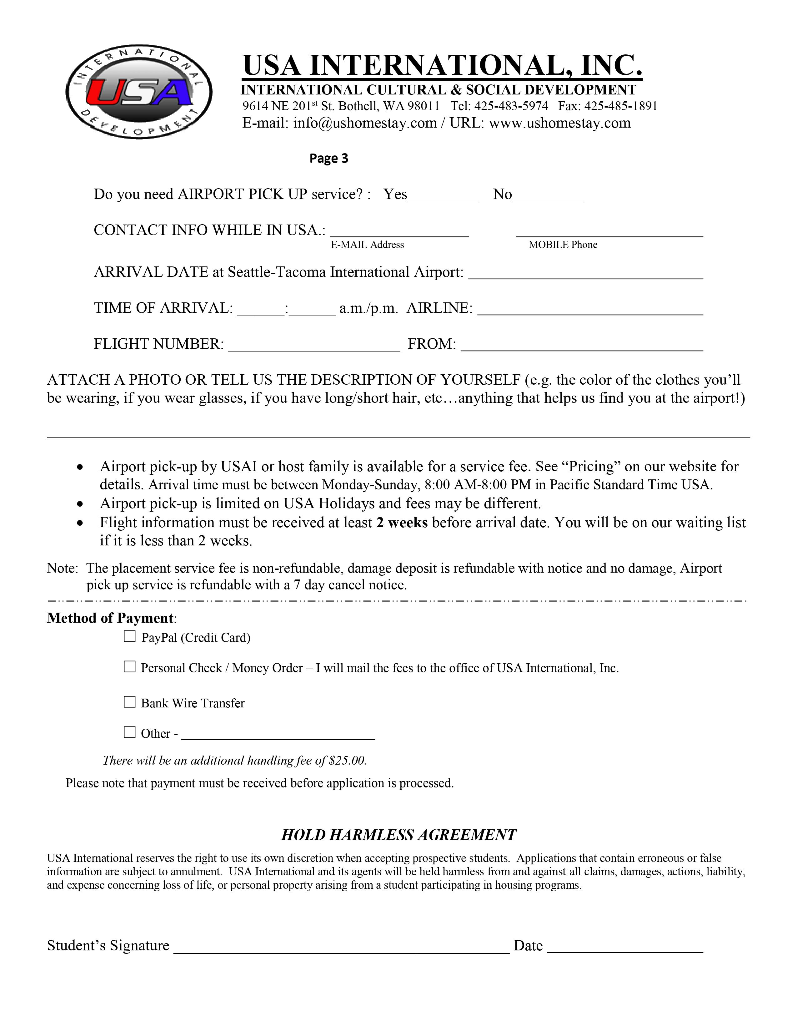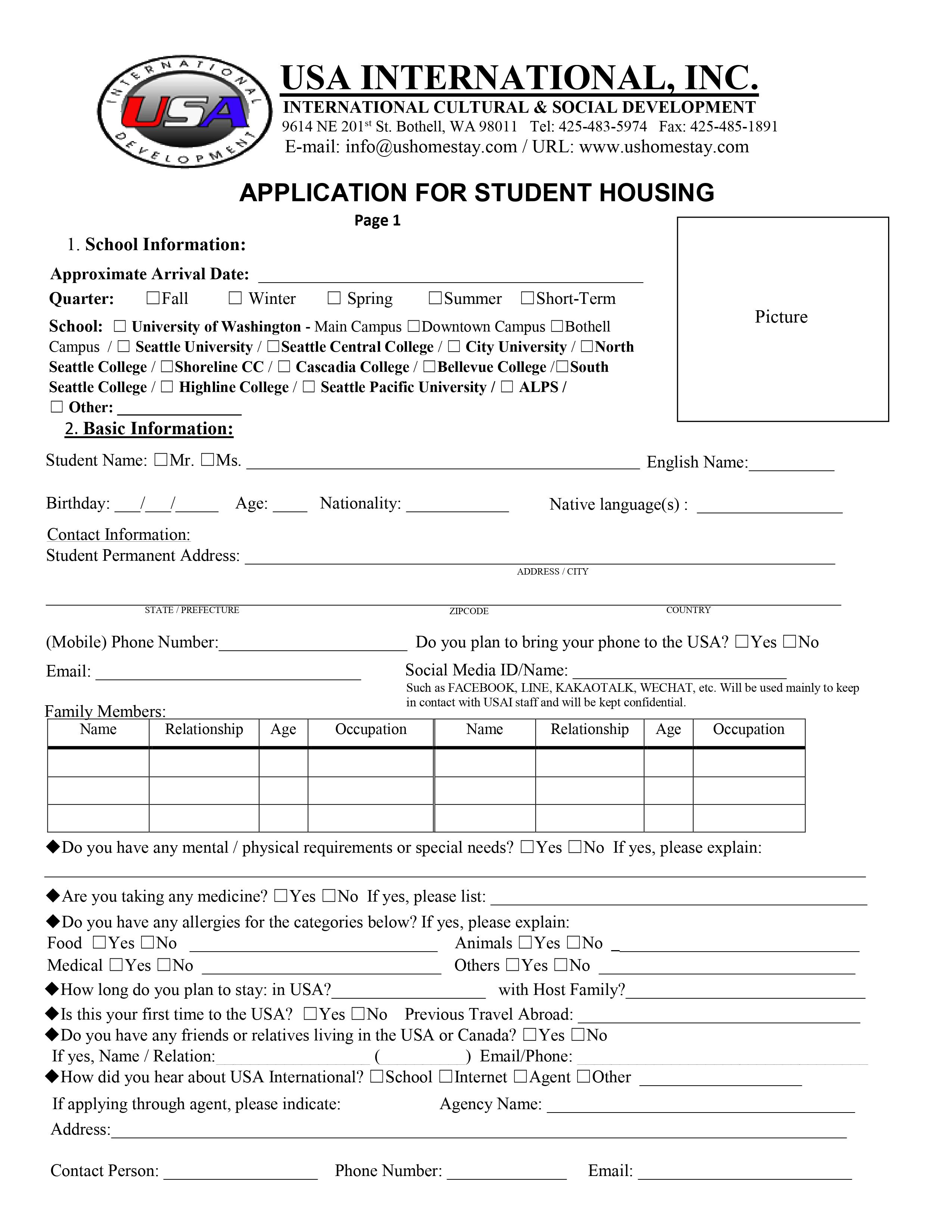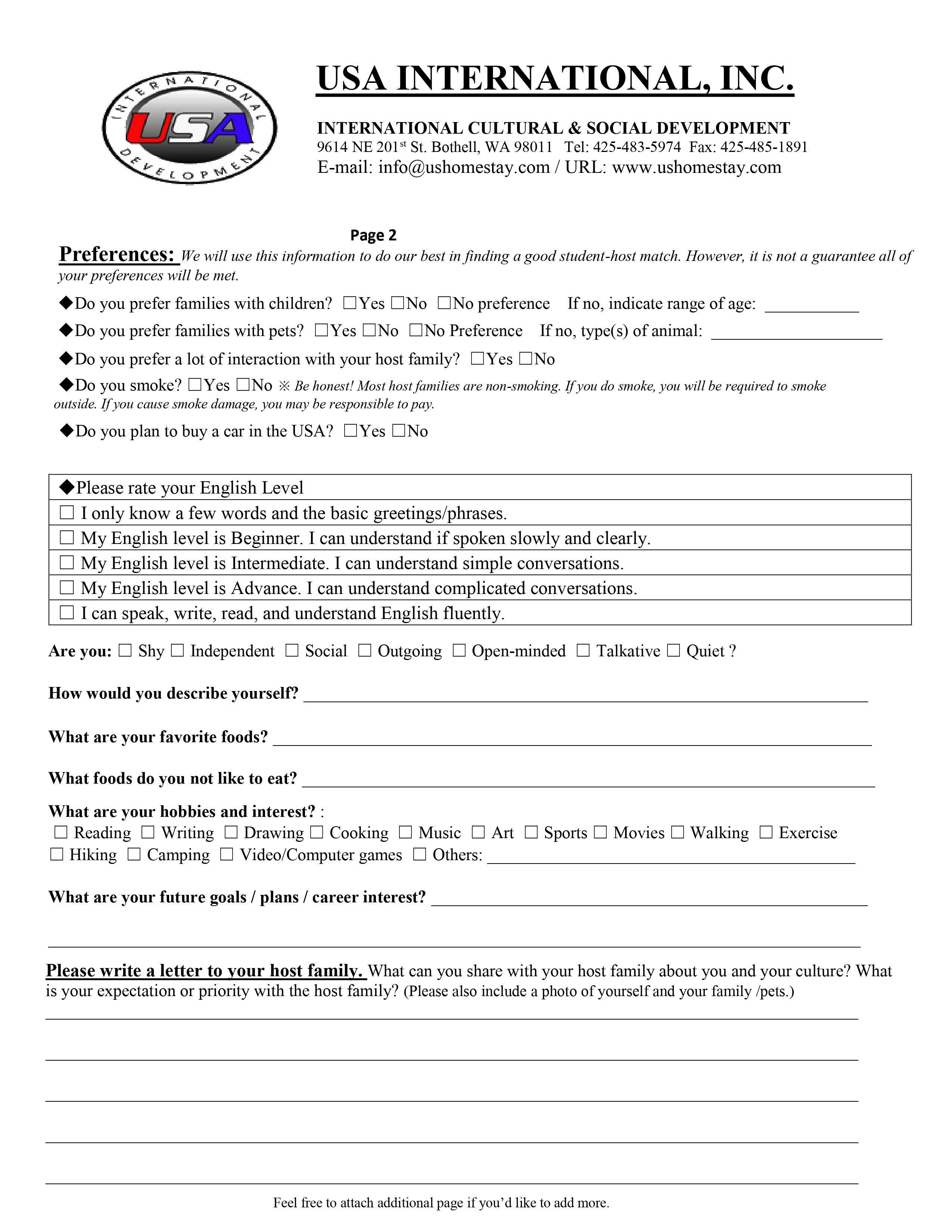 USA INTERNATIONAL DEVELOPMENT, INC. Địa chỉ: 9614 NE 201st Street Bothell, WA 98011 Số ĐT: (425) 483-5974 Mail: info@ushomestay.com Website: ushomestay.com