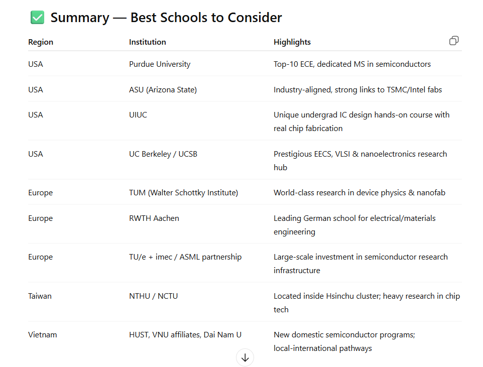 Bạn có cần hỗ trợ chọn trường hoặc chương trình đào tạo chuyên sâu về bán dẫn không?