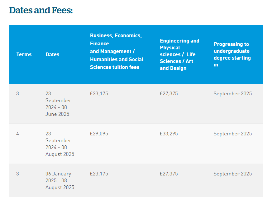 Tất cả các chương trình đều phải trả phí đăng ký £450. Phụ phí dành cho trẻ dưới 18 tuổi áp dụng cho tất cả học sinh dưới 18 tuổi khi bắt đầu chương trình.