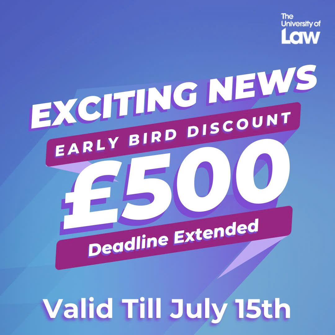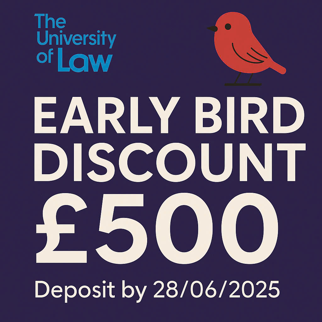 ƯU ĐÃI EARLY BIRD TỪ THE UNIVERSITY OF LAW. The University of Law trân trọng thông báo chương trình Early Bird Discount trị giá £500 dành cho sinh viên quốc tế nhập học trong kỳ 9/2025. Chúng tôi rất tự tin rằng bạn sẽ thành công đến mức nếu bạn không tìm được việc làm trong vòng chín tháng sau khi hoàn thành khóa học, bạn sẽ được hoàn lại 100% học phí, bao gồm 50% là tiền hoàn lại, cộng với 50% là tín chỉ cho một khóa học khác.*