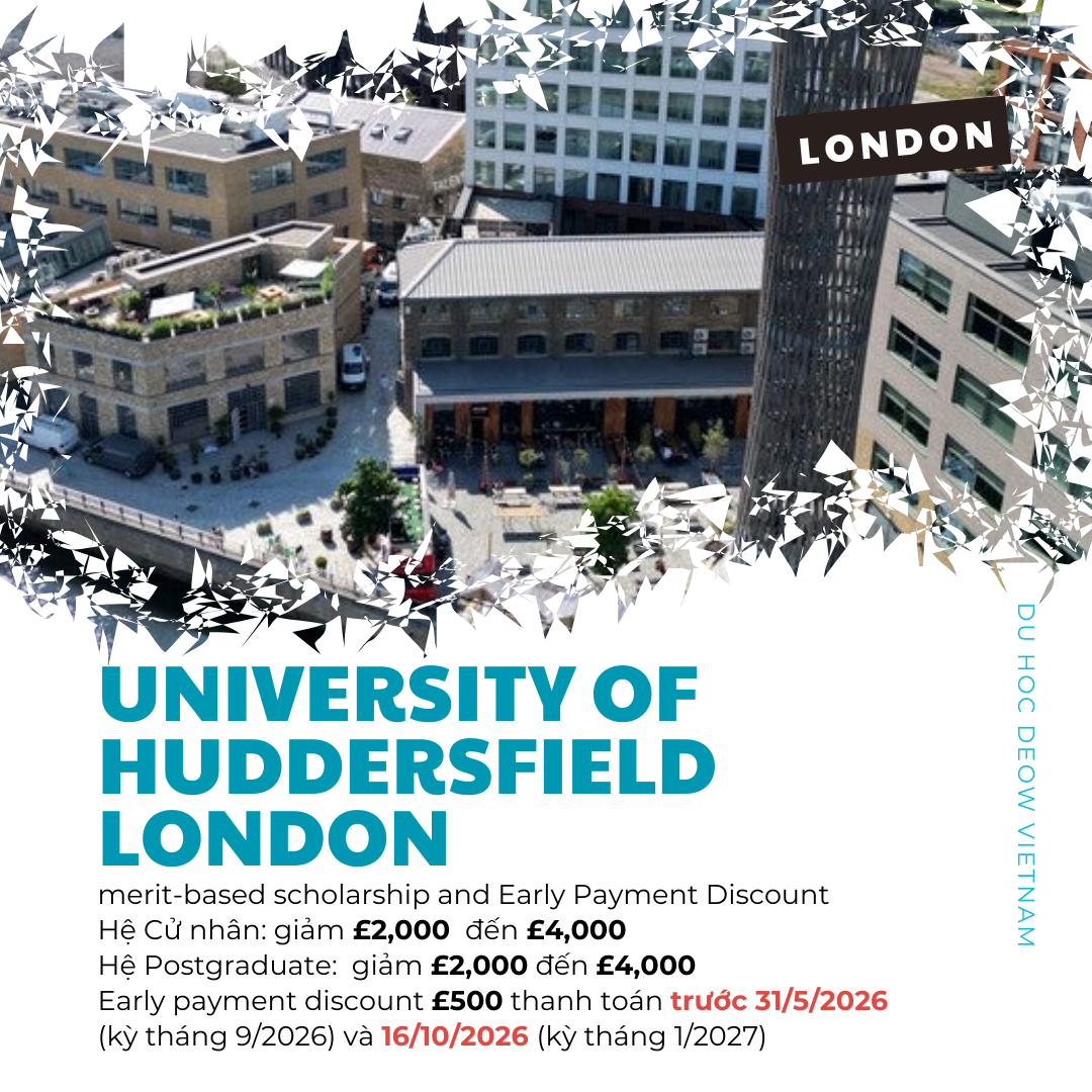Đại học Huddersfield London cấp học bổng merit trị giá từ £2,000 đến £4,000 cho sinh viên nhập học hệ Đại học và Sau Đại học năm 2026. Early bird discount £500 cho thanh toán trước 31/5/2026 (kỳ nhập học tháng 9/2026) và 16/10/2026 (kỳ nhập học tháng 1/2027)