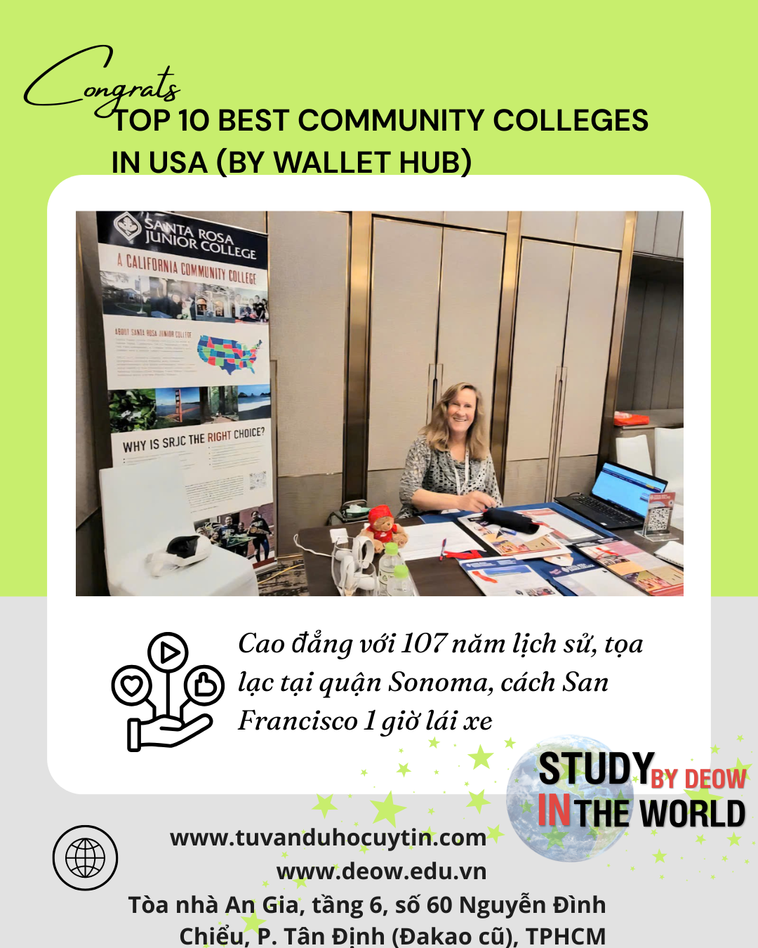 Đừng ngần ngại liên hệ ngay Du học DEOW Vietnam để nộp đơn vào ngôi trường giàu lịch sử và cung cấp chất lượng giáo dục xuất sắc tại Santa Rosa Junior College nhé.