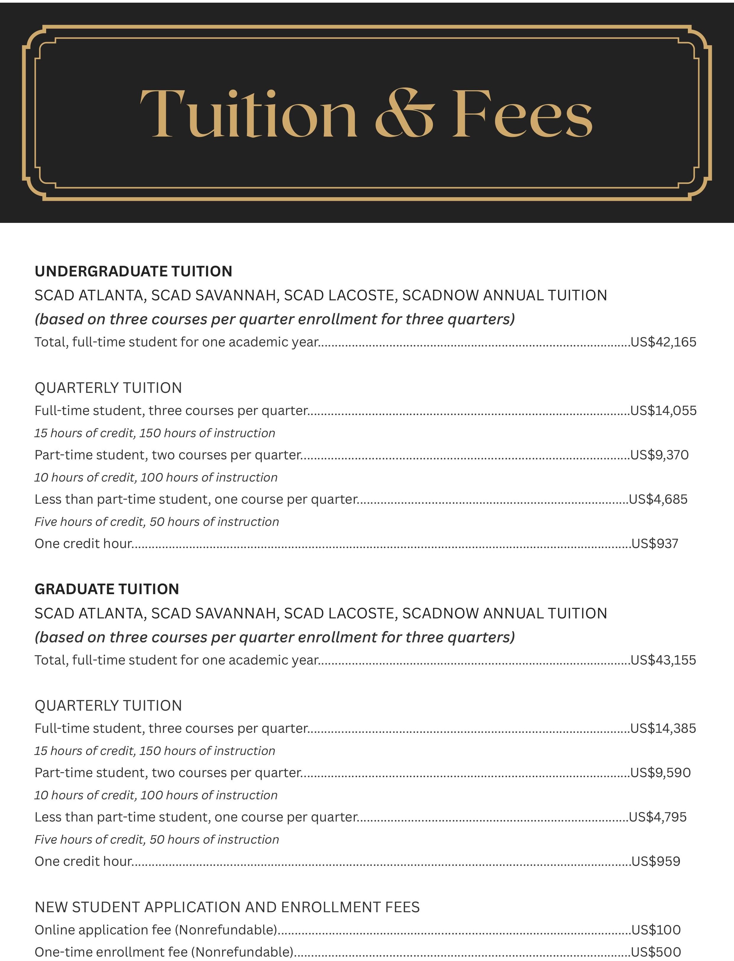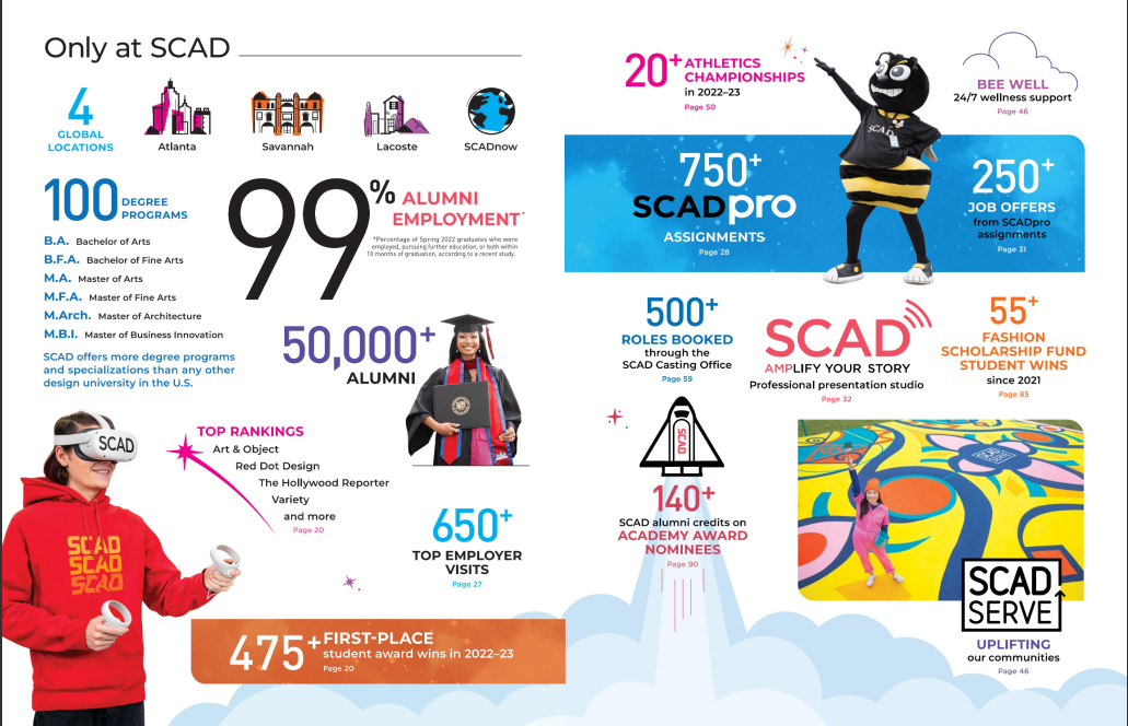 Cung cấp hơn 100 chương trình đào tạo, SCAD tôn vinh những sinh viên xuất sắc, những người sẽ tiếp tục định hình tương lai của các ngành nghề sáng tạo. Cuộc sống tại SCAD hấp dẫn trong và ngoài lớp học và tự hào có trải nghiệm đại học bao gồm các chương trình và hoạt động nhằm thúc đẩy sự tương tác, khả năng lãnh đạo và phục vụ cộng đồng của sinh viên.