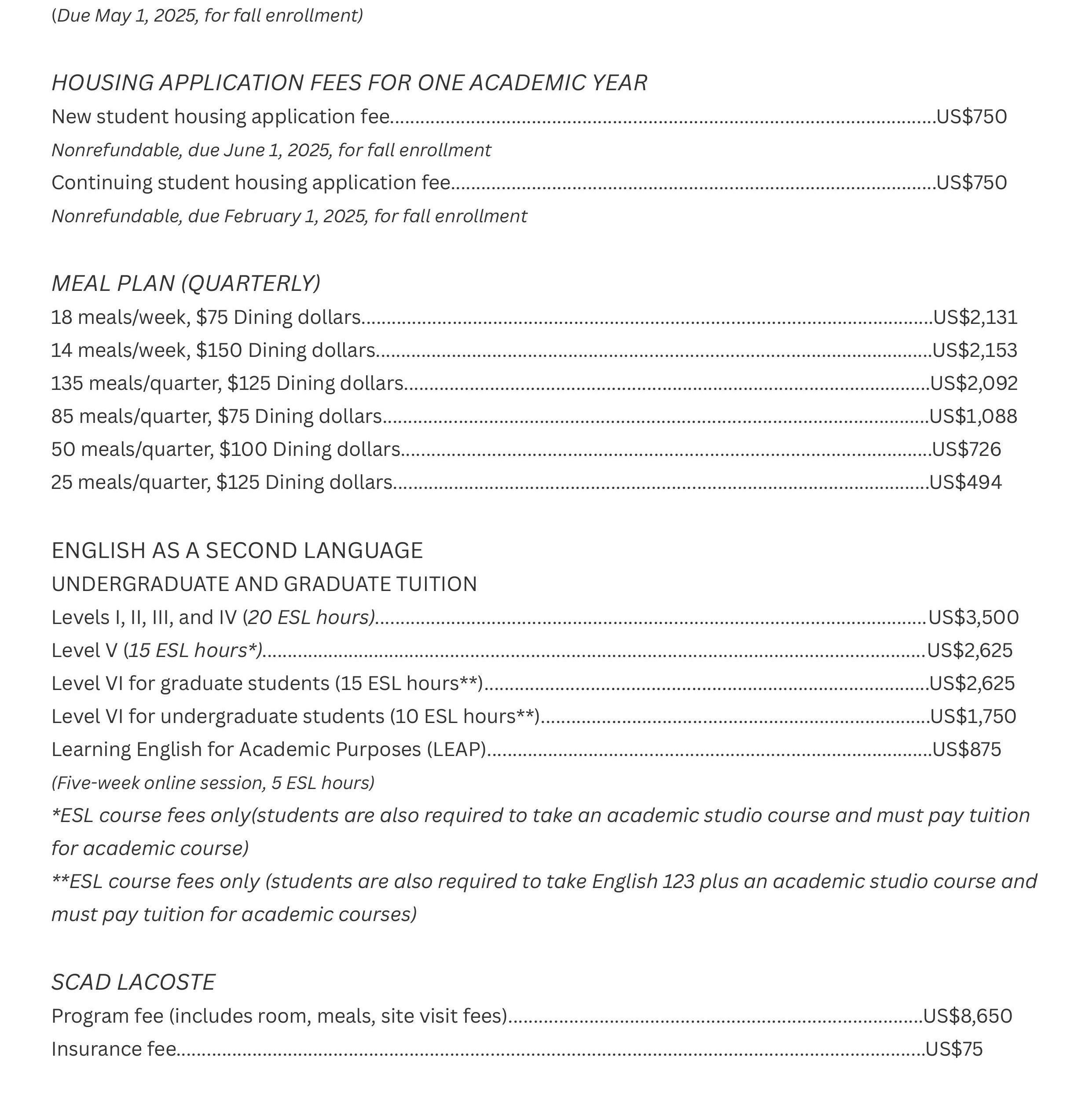 Để được xem xét, Du học sinh phải hoàn thành tất cả các yêu cầu nhập học SCAD, bao gồm nộp bảng điểm, bằng cấp và thành tích trước ngày 5 tháng 12 năm 2025. Sinh viên nên đăng ký với DEOW Vietnam
