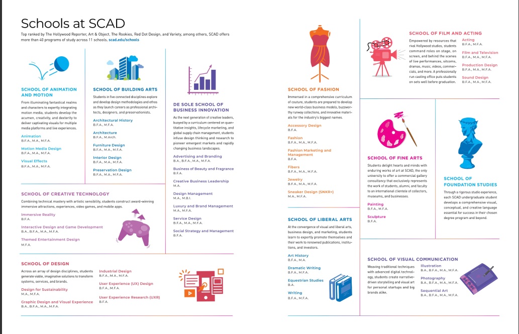 Đại Học SCAD cung cấp nhiều chương trình cấp bằng và chuyên ngành hơn bất kỳ trường đại học nghệ thuật và thiết kế nào khác, SCAD có đủ điều kiện đặc biệt để chuẩn bị cho những sinh viên tài năng bước vào sự nghiệp chuyên nghiệp về sáng tạo.