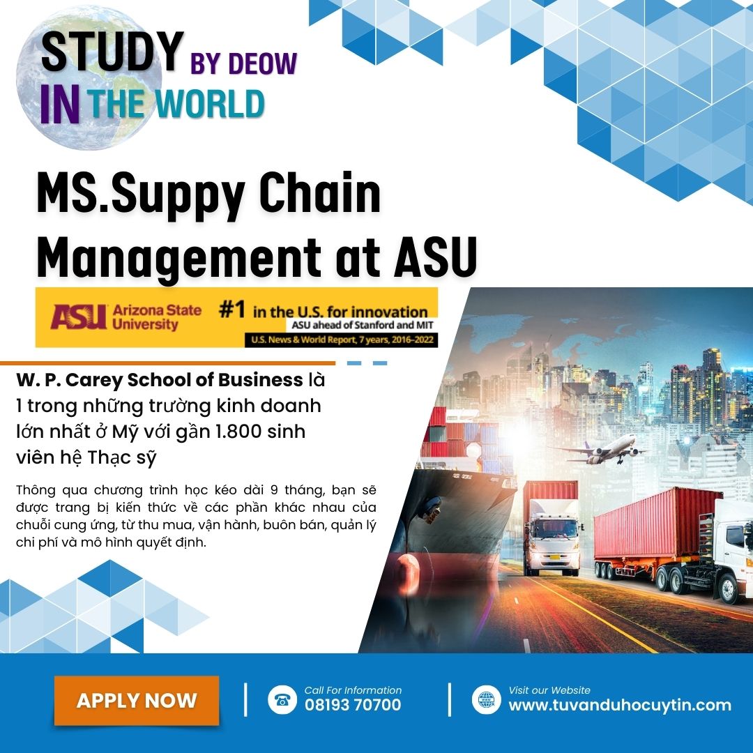 Bạn đang có mong muốn theo đuổi sự nghiệp trong lĩnh vực vận hành chuỗi cung ứng, không đâu khác ngoài Arizona State University (ASU) sẽ là bệ đỡ vững chắc cho con đường của bạn. MS. Supply Chain Management của ASU xếp thứ 3 tại Mỹ (theo US News & World Report 2023-2024), và là một trong những chuyên ngành kinh doanh có thứ hạng cao nhất của ASU.