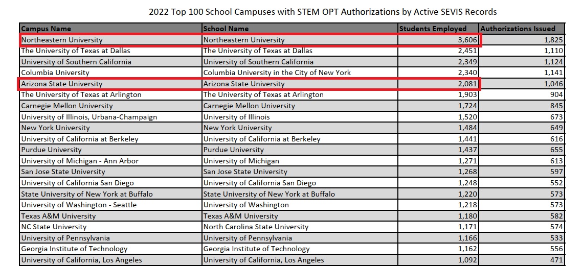 Deow Vietnam chúc mừng Trường đại học Northeastern University (NEU) và Trường đại học Arizona State University (ASU) dần đầu Top 100 trường ở Mỹ có nhiều sinh viên quốc tế tuyển dụng theo chương trình STEM OPT nhất. Cụ thể Trường đại học tư thục Northeastern University (NEU) đang là người dẫn đầu và trường đại học công lập Arizona State University (ASU) đang giữ vị trí số 5.
