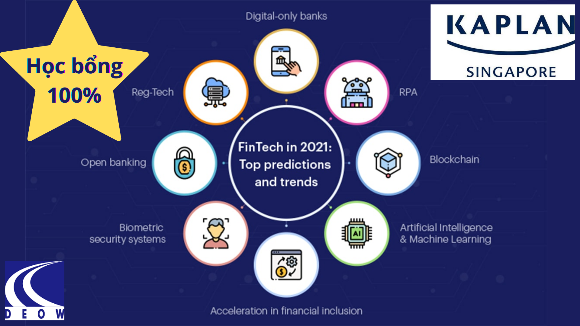 Fintech - Ngành Công nghệ Tài chính đón đầu xu thế. Kết hợp với trường University College Dublin, thuộc top 1% thế giới, Kaplan đã đưa vào giáo trình đào tạo bằng Cử nhân danh dự ngành Fintech. Học bổng 100% dành cho sinh viên Kaplan năm 2022.