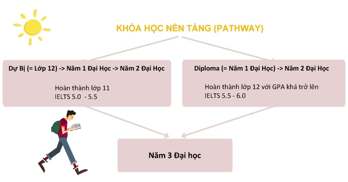 - Thông thường, một khóa học nền tảng được cung cấp trong suốt một năm. Đôi khi điều này không thực tế hoặc không thể thực hiện được về mặt hậu cần đối với sinh viên quốc tế, vì vậy nhiều tổ chức cung cấp khóa học bắc cầu để chuẩn bị cho sinh viên vào chương trình cử nhân khi du học tại Úc.