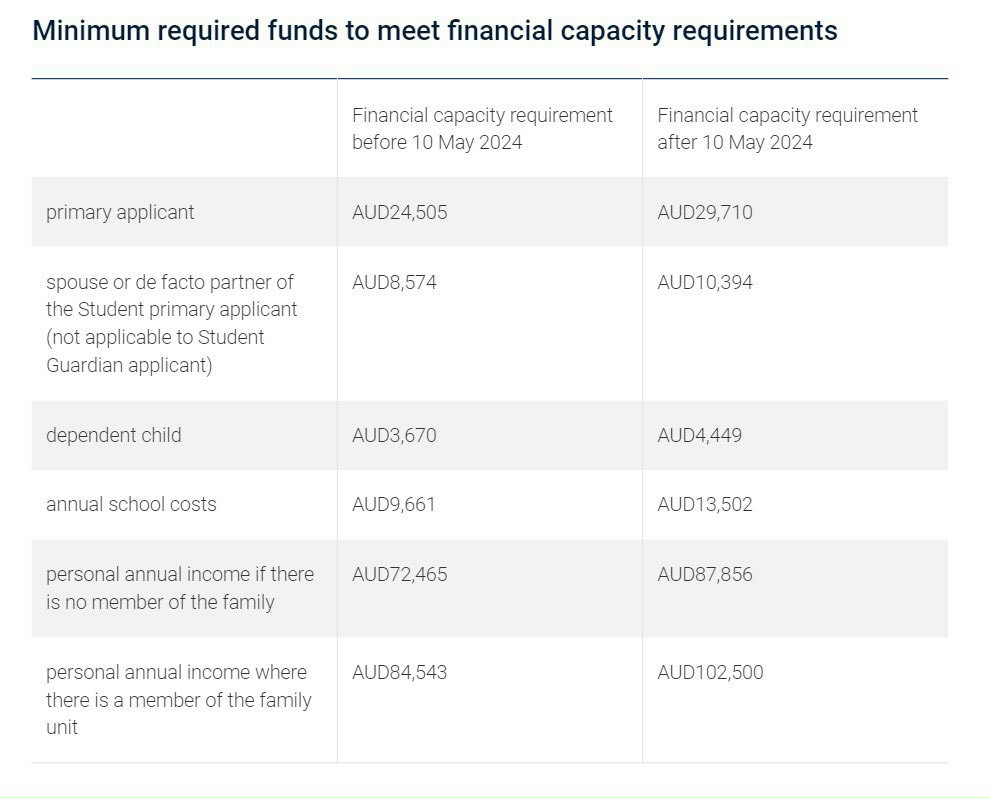 Quy định mới có hiệu lực từ ngày 10 tháng 5 /2024 và yêu cầu sinh viên quốc tế phải xuất trình bằng chứng tiết kiệm ít nhất 29.710 đô la Úc. Số tiền này gần đây đã được tăng lên 24.505 đô la Úc từ 21.041 đô la Úc vào tháng 10 năm 2023.