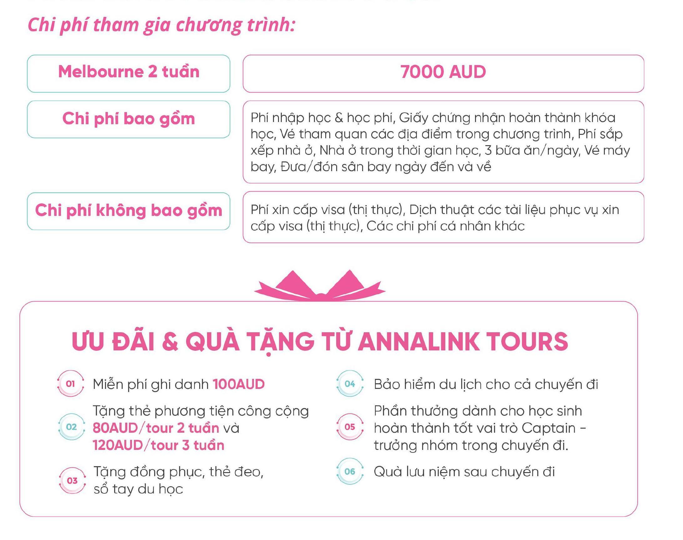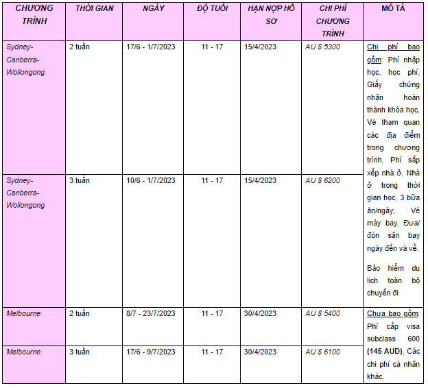 Dành cho học sinh từ 11-17 tuổi. Thời gian khởi hành dự kiến: 13/6/2026 - 28/6/2026. Chi phí: $7,000 AUD ~ 122,923,000 VND.