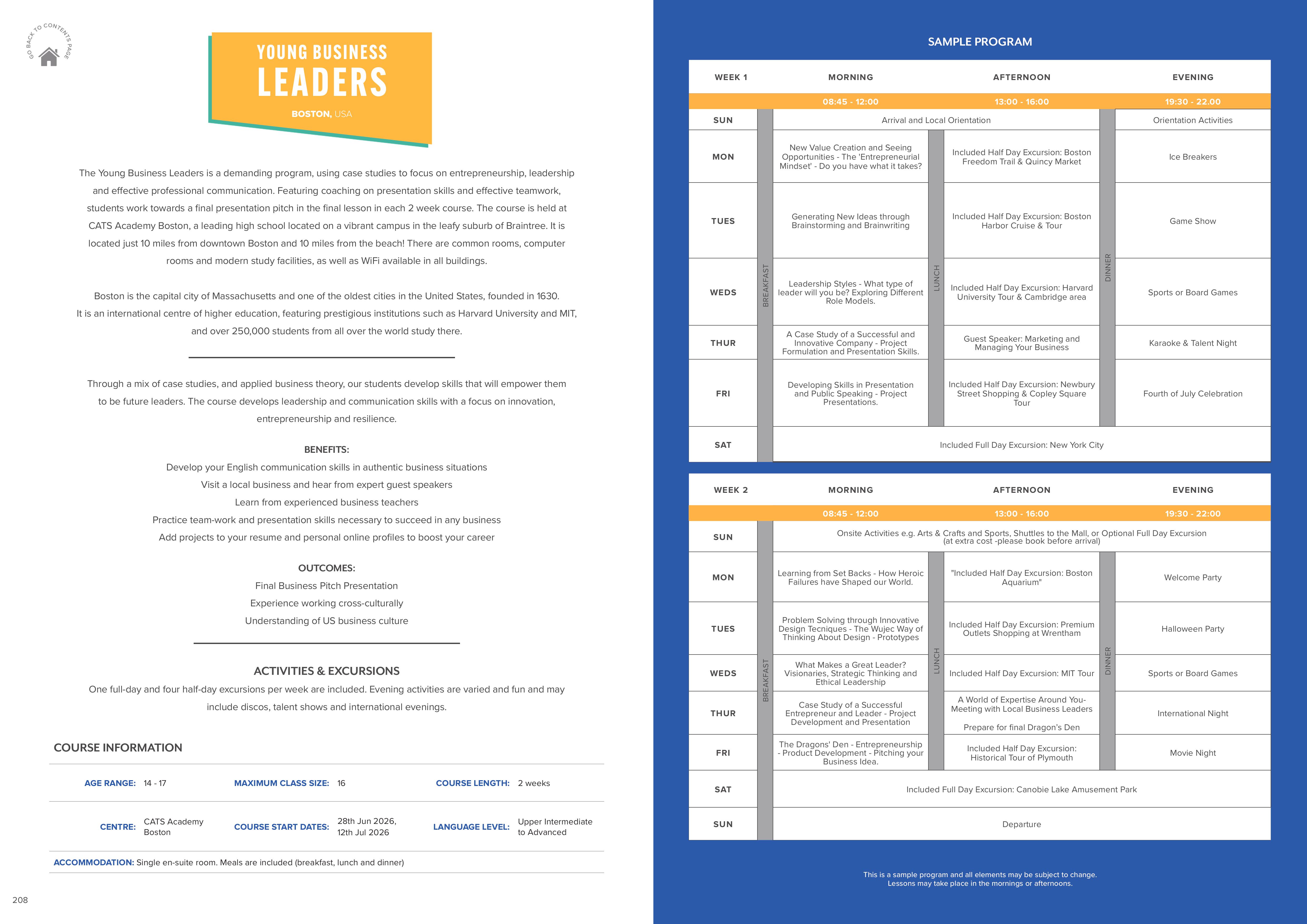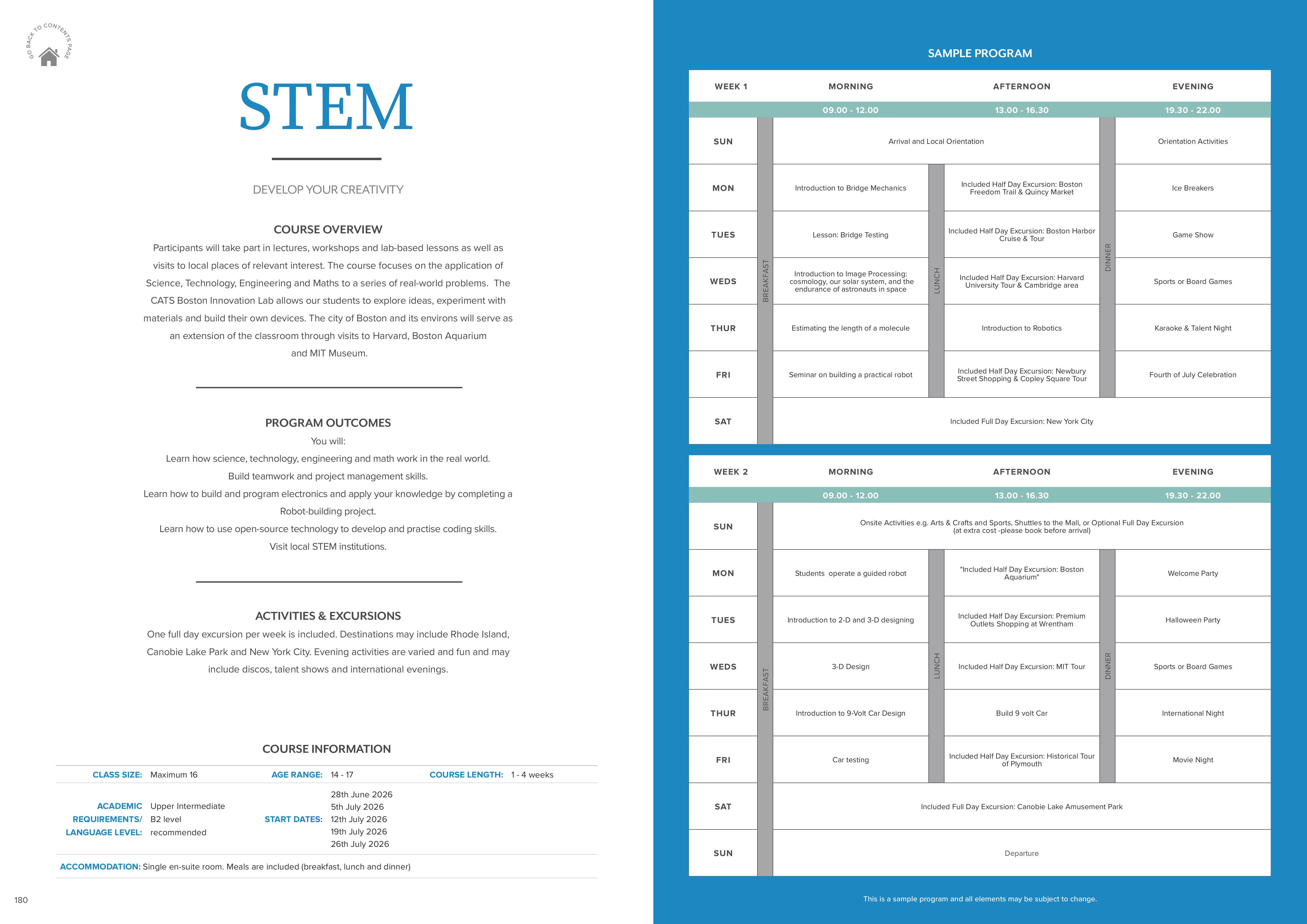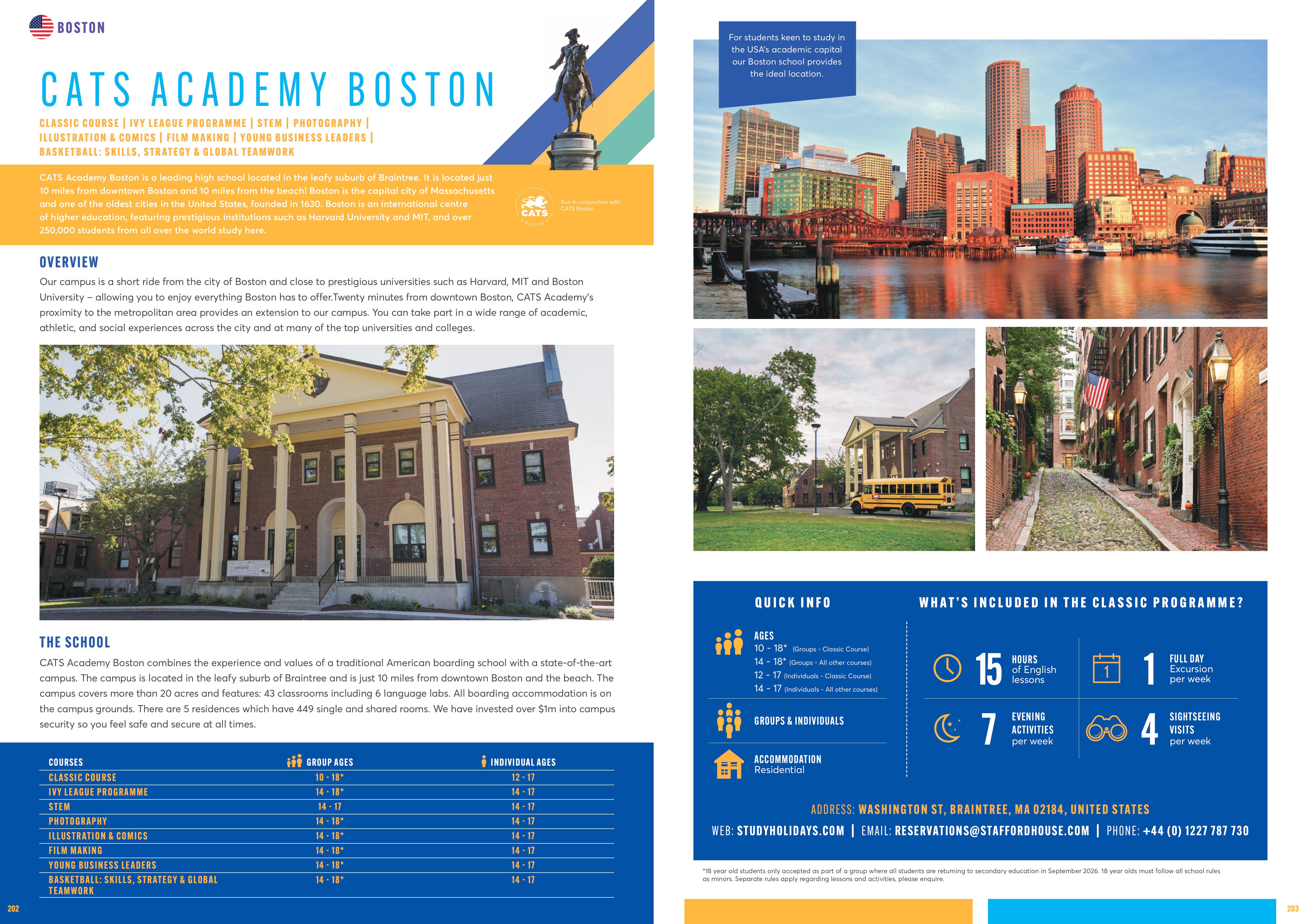 - Trại hè được tổ chức tại CATS Boston, trường trung học nội trú hạng A+ Niche và có chất lượng giảng dạy xuất sắc với 5 năm liền học sinh quốc tế được nhận vào Đại học top của Mỹ: MIT 2022, Brown 2023, UPenn 2024, Stanford 2025, Cornell 2026. Trường CATS Boston cách trung tâm Boston chỉ 20 phút ô tô, lý tưởng cho học sinh mở rộng môi trường học tập ra ngoài khuôn viên trường học.