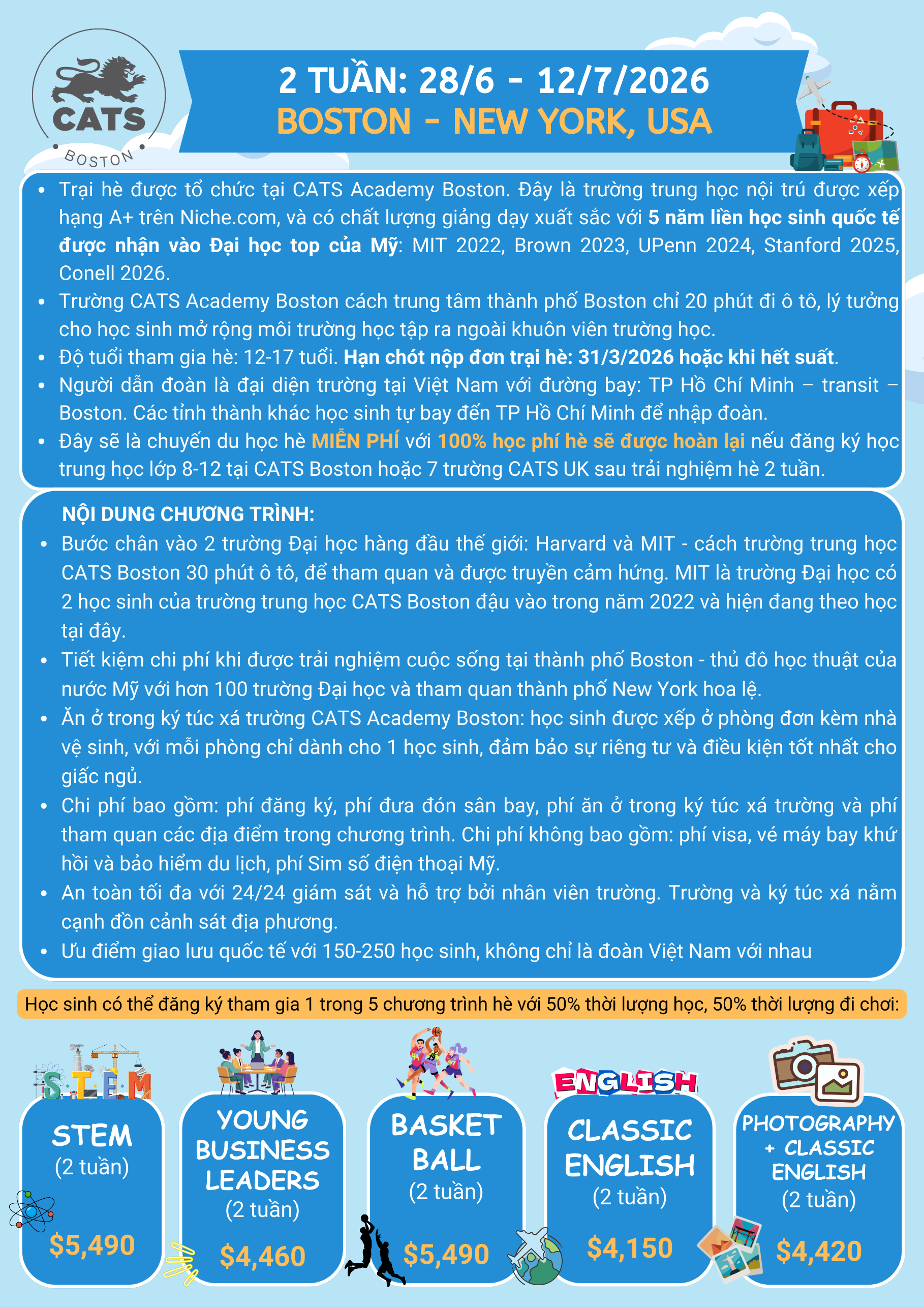 TRẠI HÈ CATS ACADEMY BOSTON 2026 (STEM - BUSINESS - BASKET BALL - ENGLISH - ARTS)
